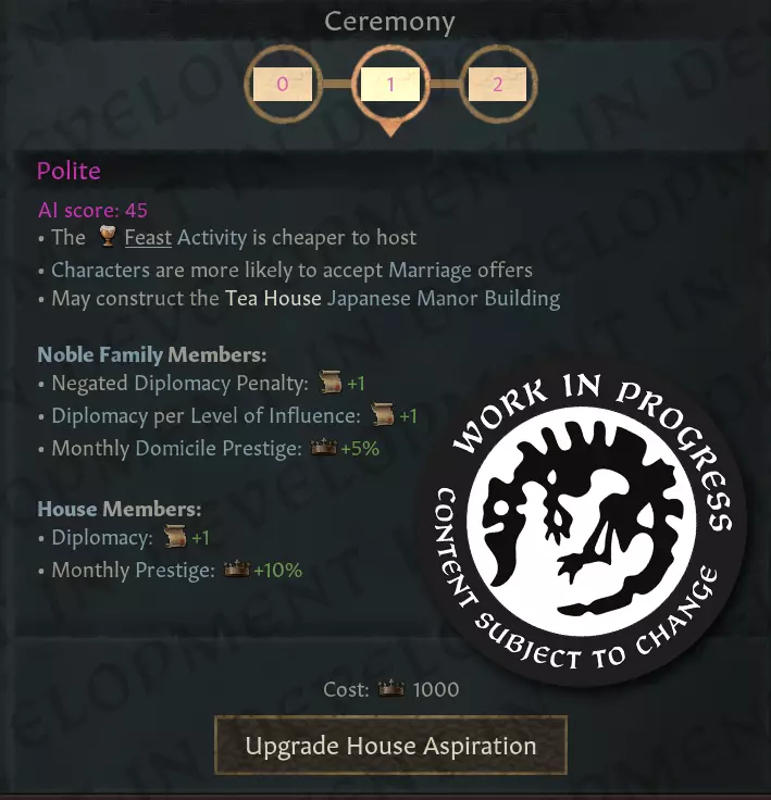 【帝国政策】法律窗口、美术资源以及附庸好感度需求仍在开发中! 其他政策会改变日本各政体间的平衡,或在付出机会成本的前提下提供简单的情境增益。 相反,如果日本面临真正的外来入侵威胁,【国防动员】政策将解锁,提供额外的优势值加成,并允许【律令制】统治者征召通常仅限【宗领制】使用的【骑马武士】弓骑兵部队。 家族抱负 日本的每个家族都拥有一项抱负,类似于拜占庭的家族能力,代表整个家族的特质与目标。每项抱负分为多个等级,每个等级都会提供新的增益。家族首领可以消耗声望来提升当前抱负的等级,或更改抱负类型。更改类型后,将从最低等级重新开始。