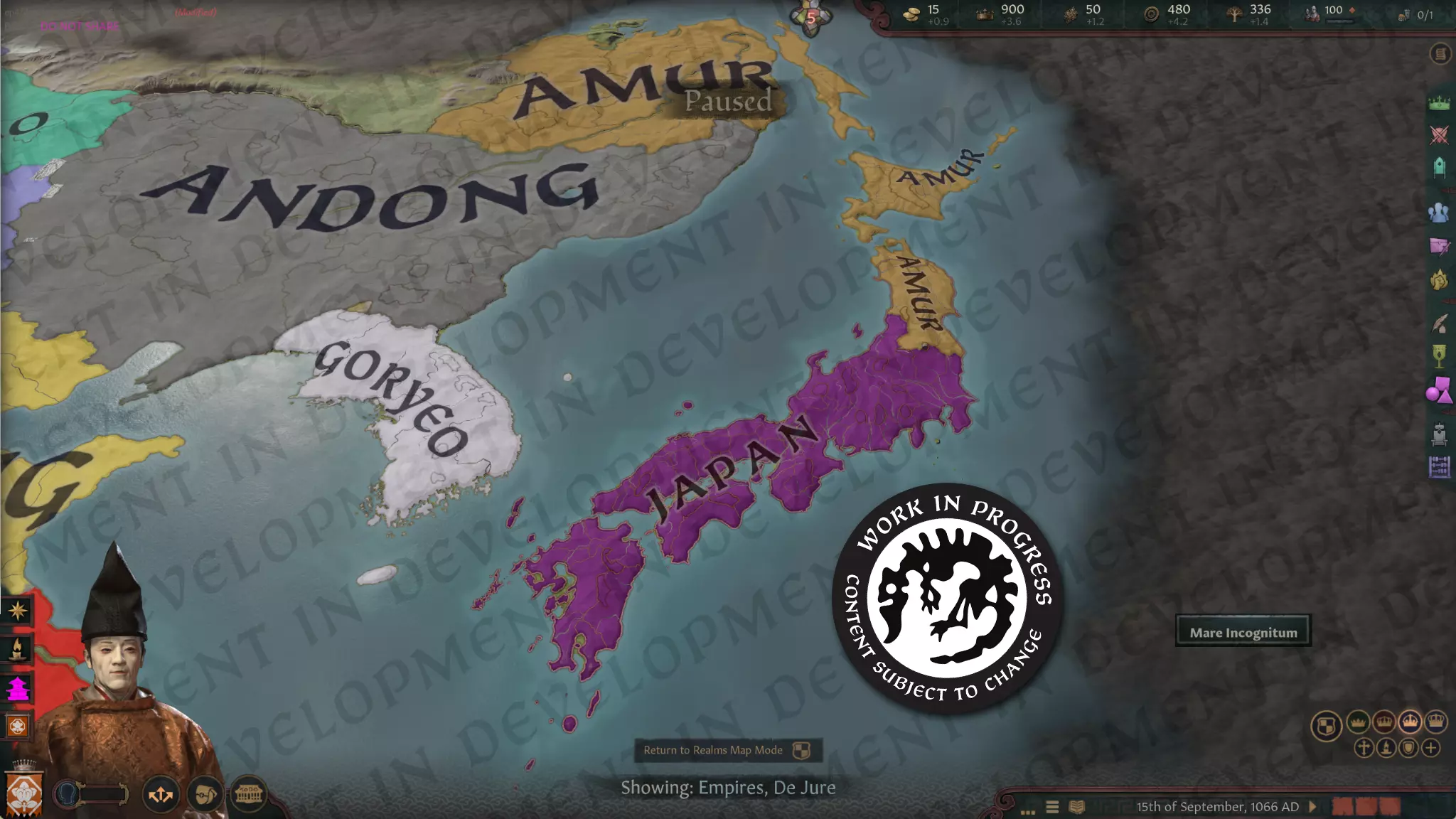 【法理帝国地图模式】 如你所见,游戏开局时日本对本州岛北部没有法理权,这是因为当时正持续对虾夷部落进行征战,且该地区是日本官僚体系整合程度最低的部分。相反,日高见王国(若由日本统治则称为陆奥)与萨哈林岛和虾夷国(Aynumosir)的北海道岛一同,是阿穆尔帝国的法理领土。在大陆上,三韩帝国(或称高丽)与安东帝国接壤,安东帝国由渤海国及其周边地区组成。