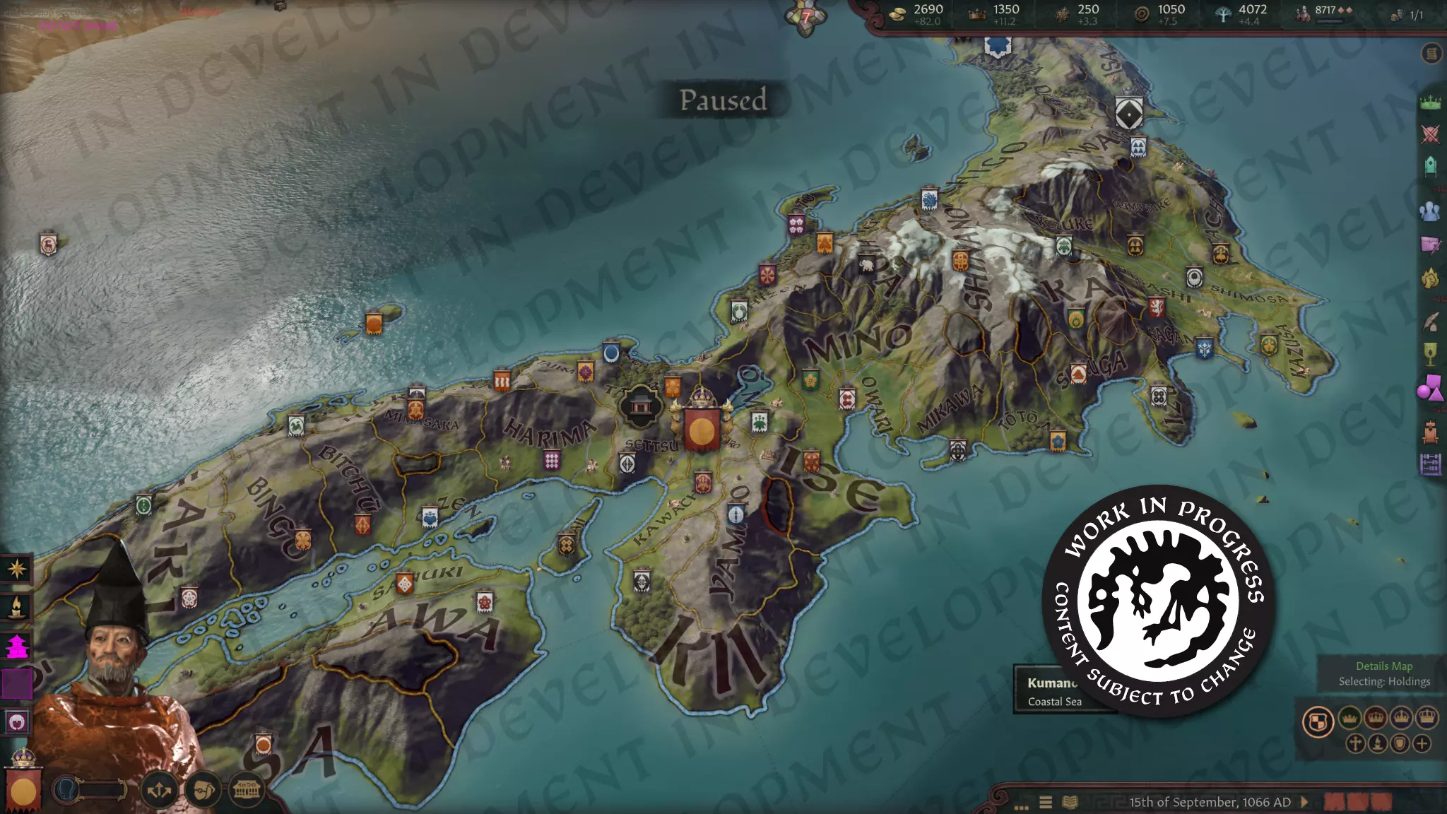 【家族集团窗口,目前仍在开发中】 每个家族集团都有一个凝聚力值,保持较高的凝聚力值可为所有成员解锁额外加成。凝聚力基于成员家族的数量和政体、其家族愿景是否与领导家族一致,以及成员家族之间的关系。 领导家族的愿景是集团的一种定义性原则;以服务为导向的集团自然代表律令制的利益,而以力量为核心的集团则寻求扩张军事力量。家族的愿景通常不受其政体类型的限制,因此可能存在各种组合。通常情况下,由相同志向类型家族领导的多个集团并不常见,利益往往会围绕最有能力的领导层聚集。 关键在于,集团成员会自动加入其集团领导家族的家主所属的派系,提升他们成为关白的继承分数(如果他们是律令制下的),并且还会参与家主的防御战争,包括因监禁或剥夺头衔尝试而引发的暴政战争。这使得挑战一个集团需要慎重考虑,而且任何发生的战争都比日本封臣仅仅是孤立的伯爵级统治者且联盟分散时的情况影响要大得多。此外,为你阵营内家族成员(无论是你自己的家族还是其他家族)获取总督职位,可直接帮助增强你的派系和继承分数,或防止对你地位的攻击,而没有阵营则会让你极易受到敌人的威胁。 武士的崛起 随着平安时代的推移,许多贵族家族因与藤原氏争夺官职的激烈竞争而感到沮丧,对晋升官僚阶层不再抱有希望,于是离开首都,在各省建立庄园。与首都那些冷漠的贵族不同,这些家族的势力最终发展到实际上作为世袭地方贵族进行统治的地步。我们通过允许律令制统治者将其职位设立为封地,并将其政体转变为惣领制来体现这一点。关白会将此视为犯罪行为,所有律令制官员都可借此宣战以夺回头衔。不过,惣领制统治者比官僚更具实力,他们可以招募骑马武士弓骑兵这种武装部队类型。此外,惣领制统治者通常会联合起来进行防御,这使得阻止他们的扩张变得不那么容易。 到我们设定的最后一个开局年份时,日本几乎已完全脱离律令制体系的掌控,转而由新兴的武士家族主导,其中最著名的是平氏和源氏家族。