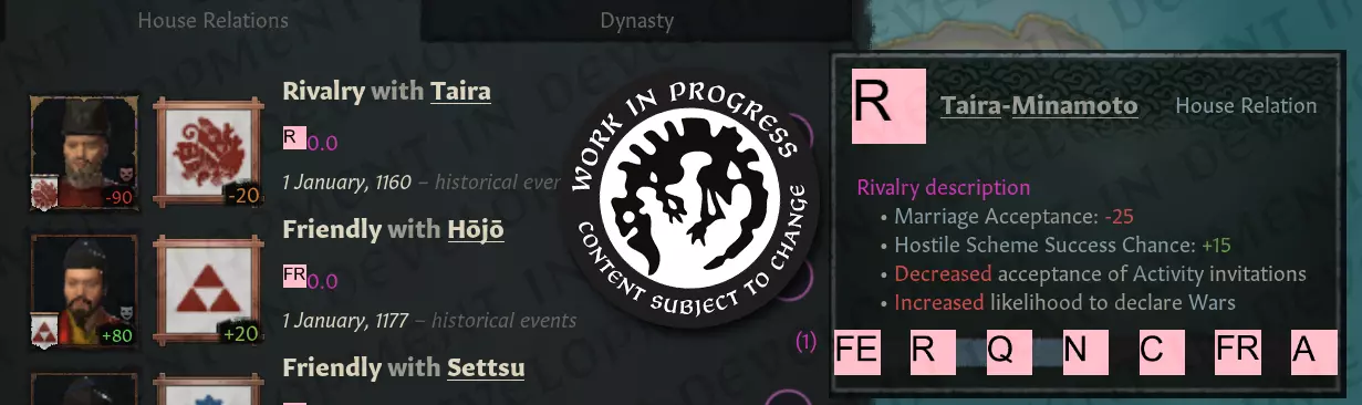 【家族志向窗口,美术仍在制作中!】 每种志向都专注于不同领域,部分志向更适合特定政体类型:服务型志向可提升总督效率和候选人评分,适合希望攀登官僚阶梯并效忠皇帝的家族;仪式型志向能增加威望和声望获取,是最高贵家族的必然选择;力量型志向则强化武装士兵和军事技能,确保在战场上的主导地位。 除了提供的加成外,家族选择的志向在一定程度上还会决定其政治目标,并且是另一项新功能【家族集团】的驱动力,这部分内容我将在稍后提及。家族关系 《天下一家》的免费更新补丁中新增了另一项以家族为核心的机制——家族关系。该机制与“敌对”“友好”等角色间关系类似,但作用对象是两个家族而非两个角色。 现在,当同一王国或相近等级的家族之间发生友好或敌对行为(例如宣战或联姻)时,这两个家族之间的关系值将会相应增减。