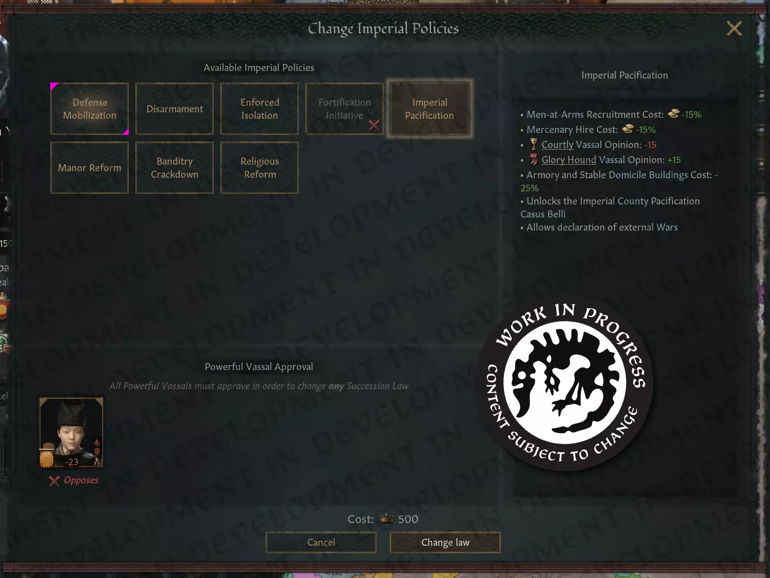 【日本天皇,注:美术资源仍在制作中】 若天皇通过影响力成功获得最高头衔,将触发事件,玩家可选择退位并以有权势的院政天皇身份统治日本,或尝试同时持有两个头衔。后者代表历史上可能出现的重新直接统治,但此举不会受到朝臣们的欢迎。 历史上,大和家族的许多分支最终被剥夺继承权以精简皇室成员,他们会采用新姓氏,最著名的便是平氏和源氏各家族,其名称取决于他们所源自的天皇。在游戏中,大和家族的总督可以组建或加入这些家族,自然形成新的分支家族。朝廷政策 日本的现任最高封君,无论是关白、征夷大将军还是天皇,都始终拥有一个独特的法律类别——以天皇名义颁布的朝廷政策。尽管政治相对稳定,但在我们所处的时代,随着官僚机构的更迭和外部政治环境的变化,日本政府的政策也发生了巨大变化。与王权权威类似,朝廷政策除了冷却时间外,可以自由更改。 这里有各种各样的政策,适用于不同的目标和情况,其中一些政策具有广泛影响的法令,能够显著改变日本列岛的游戏玩法。例如,日本帝国的统治者无法随意宣战,这体现了在我们所涵盖的大部分时期内,除了向北部边境扩张外,他们普遍缺乏征服野心。不过,通过实施【帝国扩张】政策,可解锁其他地区常见的跨领域宣战理由,并降低雇佣兵和武装士兵的招募成本。