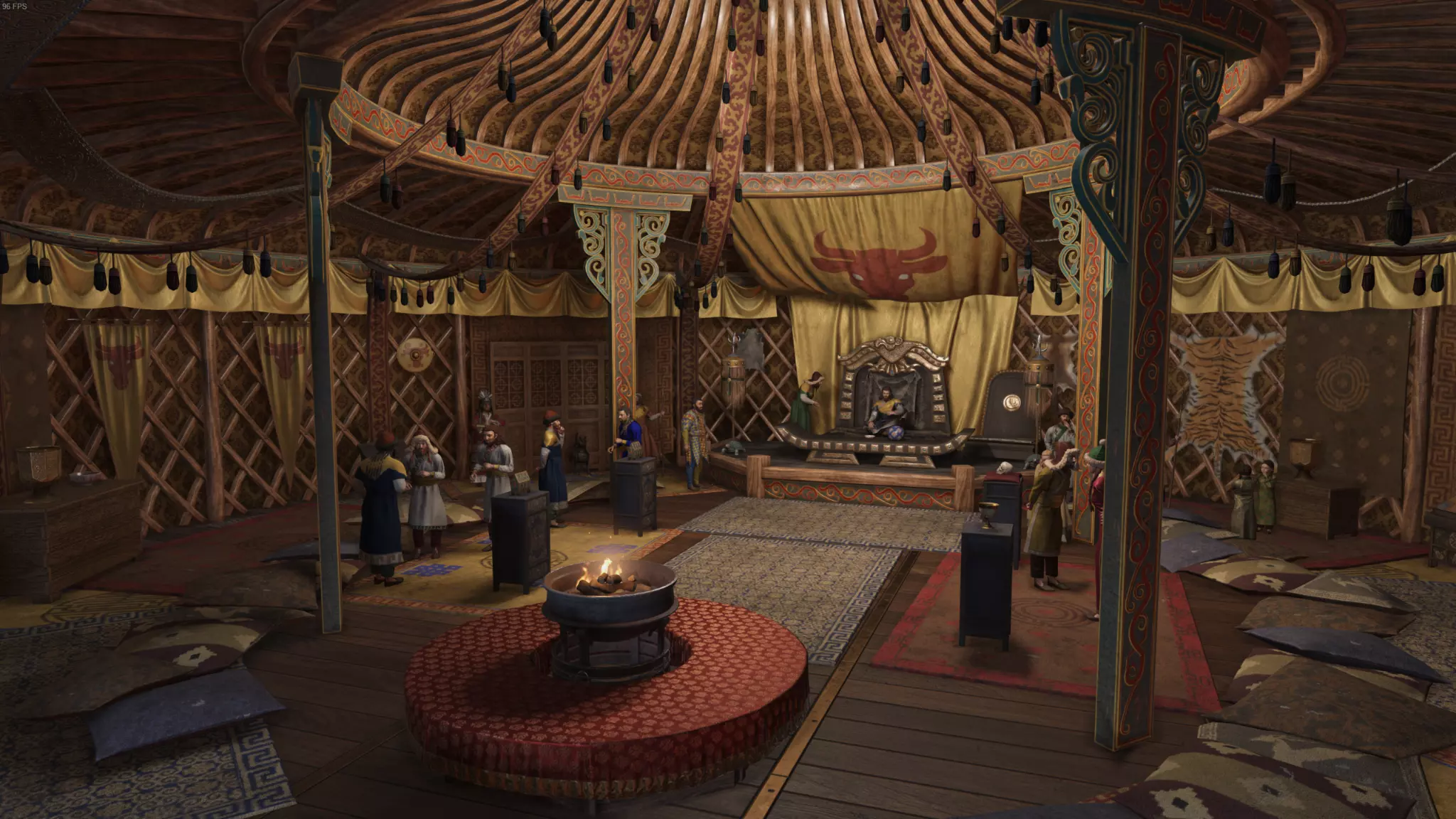 王座室 《草原可汗》中同样设有草原民族领袖的宏伟毡帐。在El Tyranos的精心打造下,我们建造了一座配得上成吉思汗的王座室。王座会根据你的宏伟等级呈现不同版本。独特的是,你的纹章会作为巨大的旗帜悬挂在你身上和王座后方。