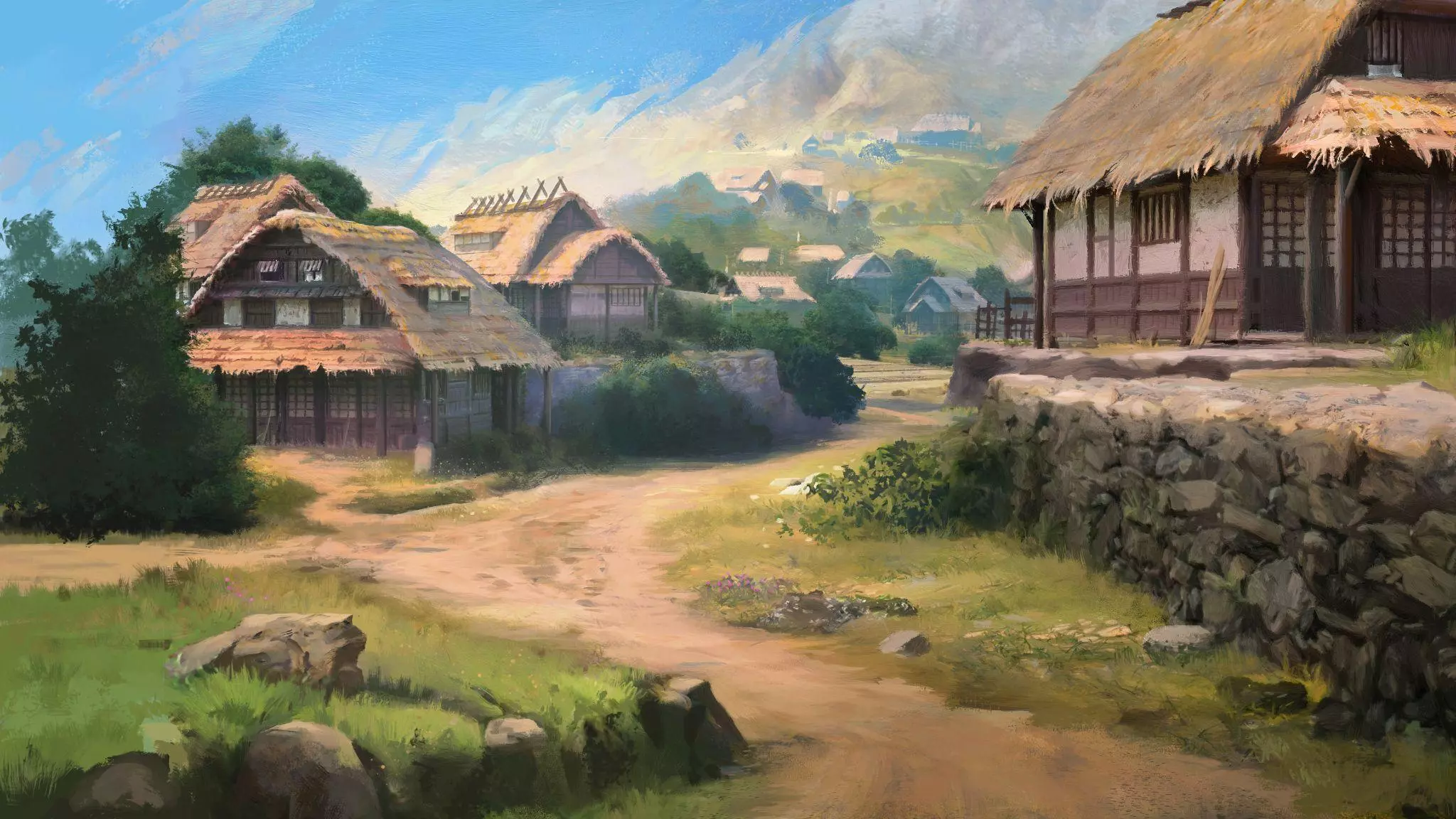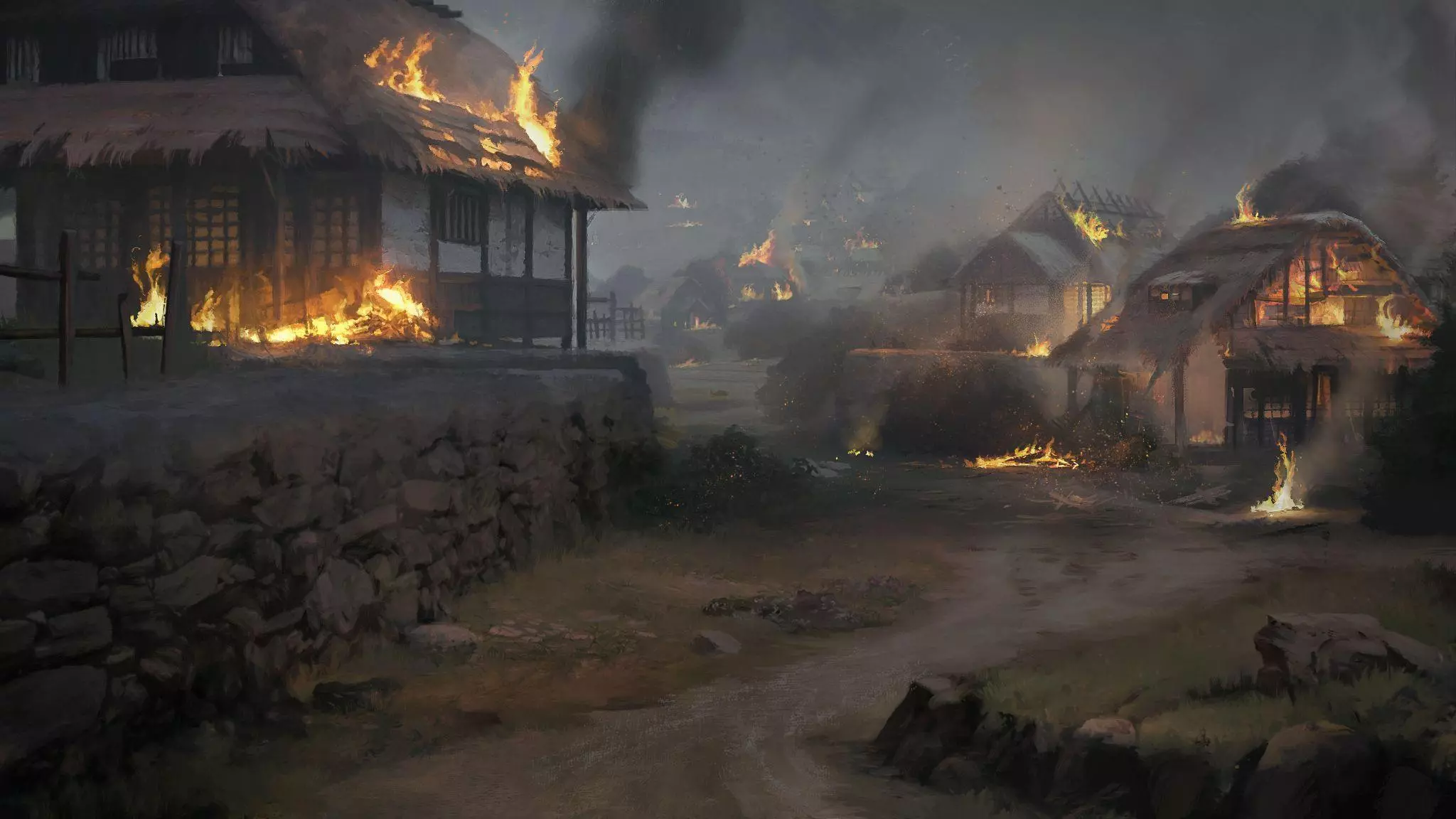 第二步,我们绘制了几幅不同颜色的草图。最终我们选择了能看到暴风雨天空与平静金色薄雾形成对比的那一幅。这有两个目的:一是将骑手与逼近的风暴联系起来,二是展示季节变化这一游戏玩法特色。