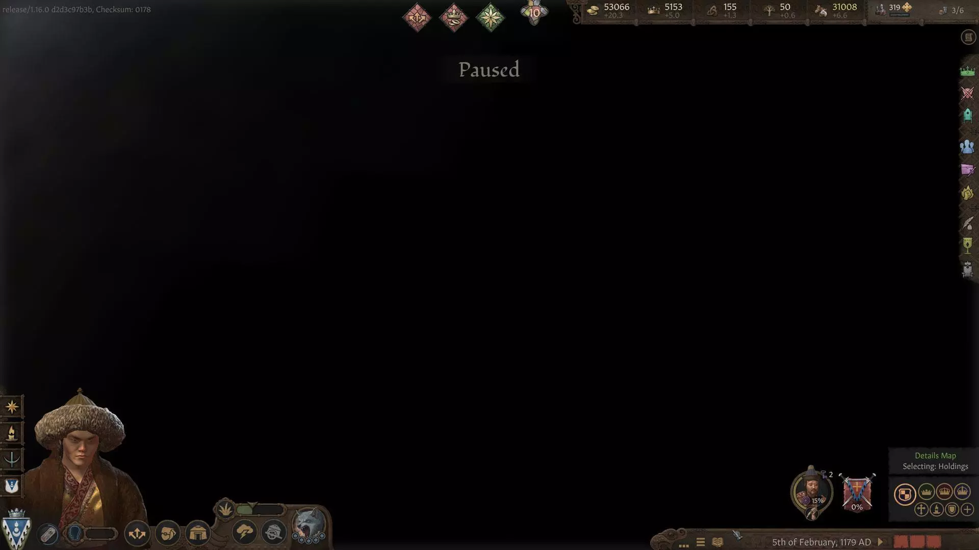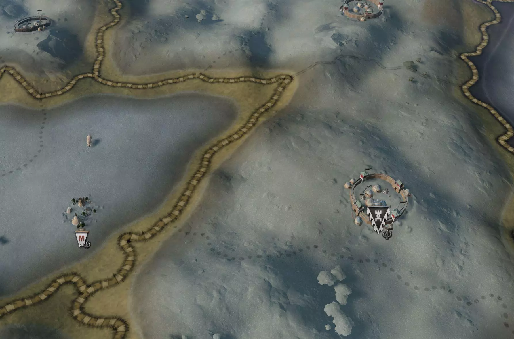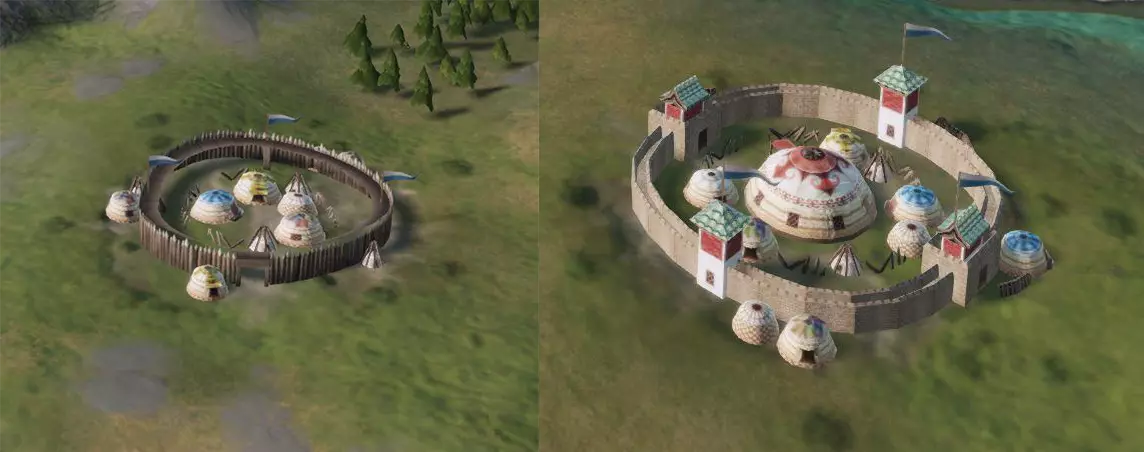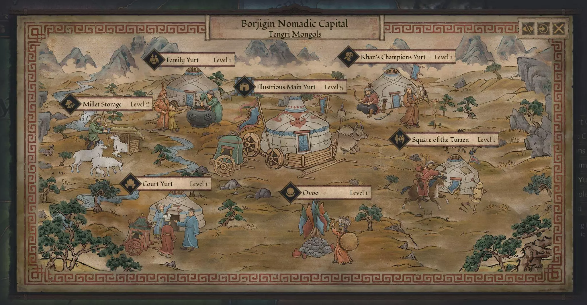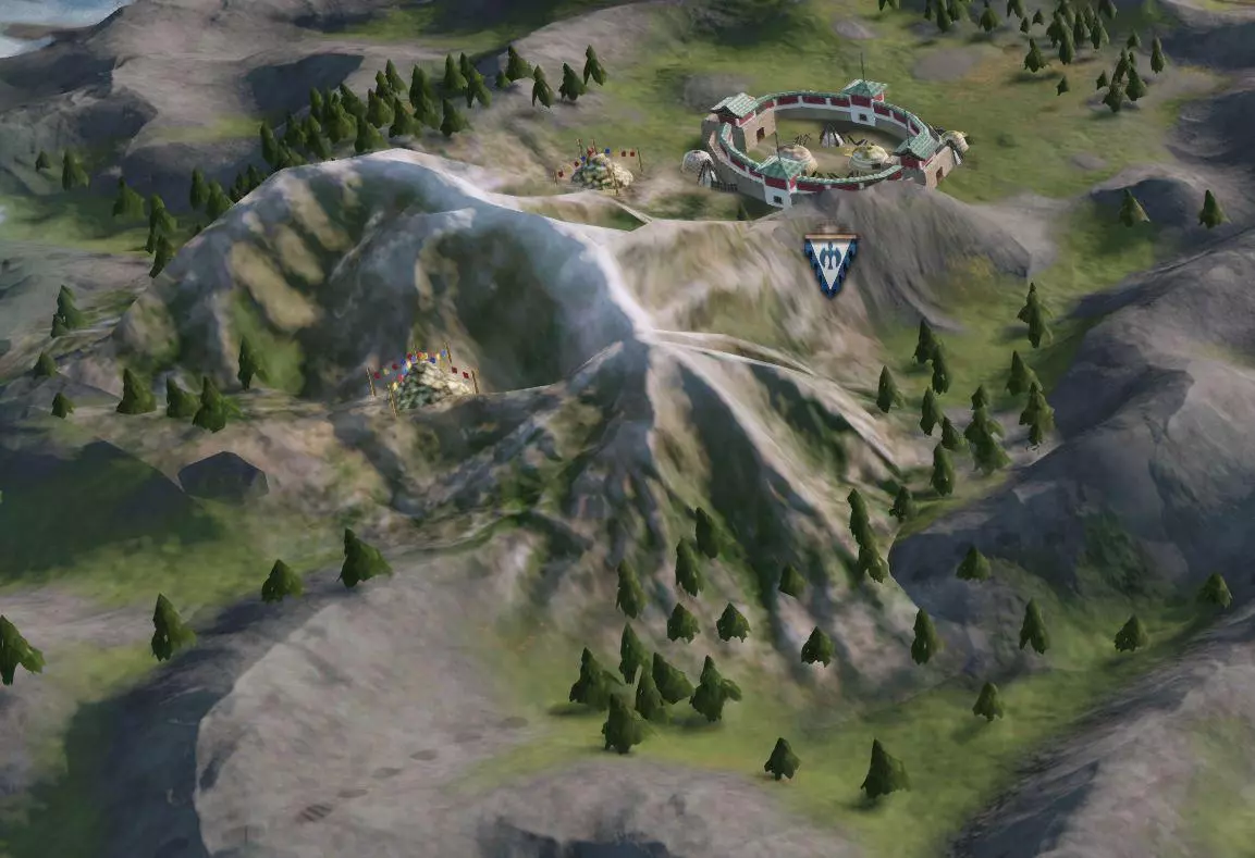 地图 正如之前的开发日志中可能提到的,草原地区包含季节系统,这是一个对游戏玩法有重大影响的机制。我们认为有必要在地图上清晰地反映这些变化,以便玩家能够直观感受到季节的更替。因此,当白色灾年(White Zud)来临时,你会看到大地被厚厚的白雪覆盖;而当出现永恒夏日时,即使是原本干旱的土地上也会蔓延出生机勃勃的绿色斑块。 草原游牧民族现在拥有独特的领地图形。可汗的宏伟帐篷周围环绕着带有彩色屋顶的蒙古包。在腾格里神庙领地上,敖包(ovoo)装饰着五颜六色的旗帜。不过,关于领地城墙的设计,我们陷入了两难的境地。虽然从逻辑上来说,大多数游牧领地不应该显示任何城墙,尤其是在栅栏级别以上的防御工事,但这与需要向玩家表明他们仍需围攻游牧领地的必要性相冲突(尽管游牧领地通常比设防城堡更容易围攻)。为了尝试解决这种玩法与叙事之间的矛盾,我们选择在防护墙内外都设置蒙古包,这样既向玩家表明需要进行围攻,又不会让游牧领地看起来像其他类型的领地那样受约束。