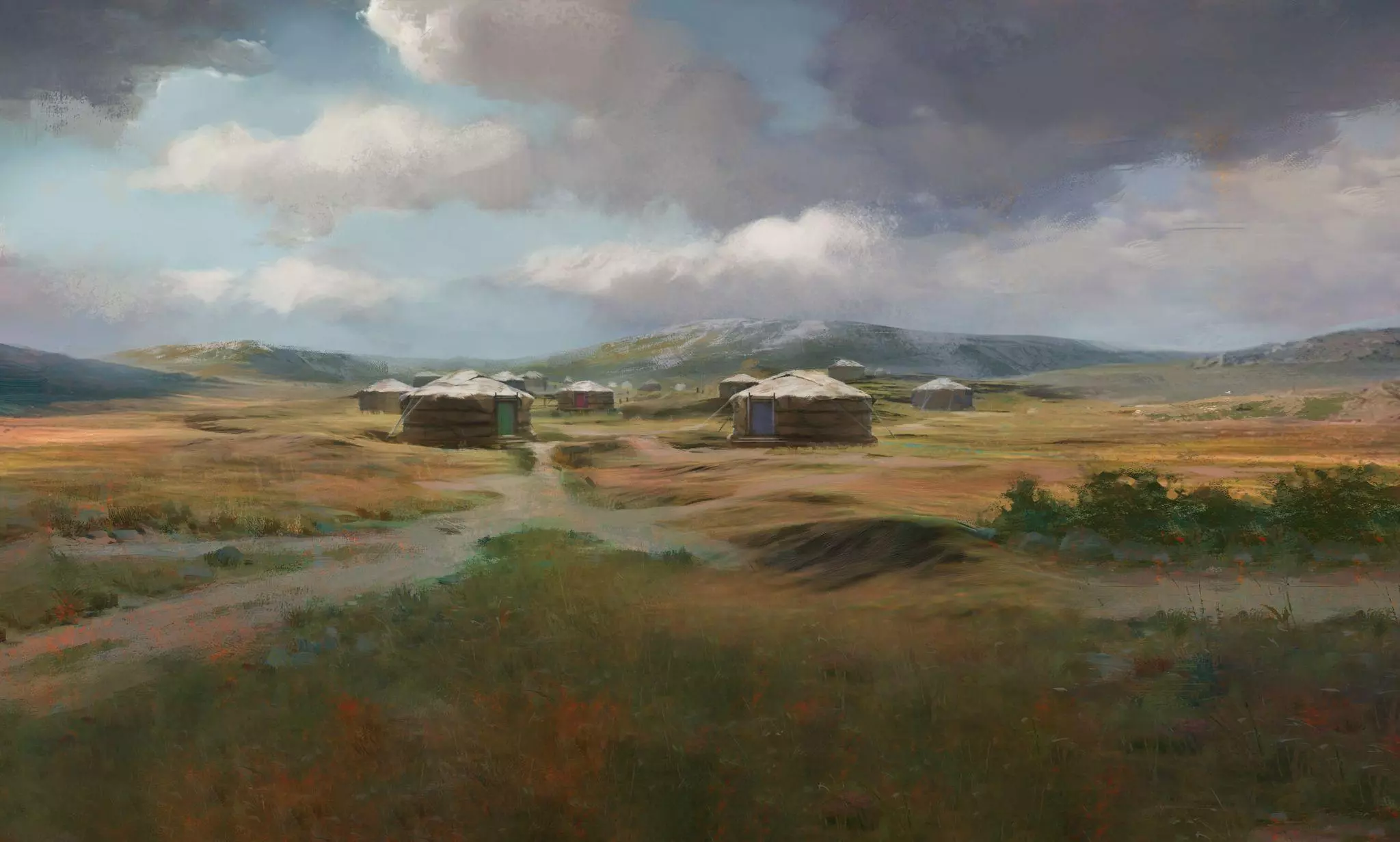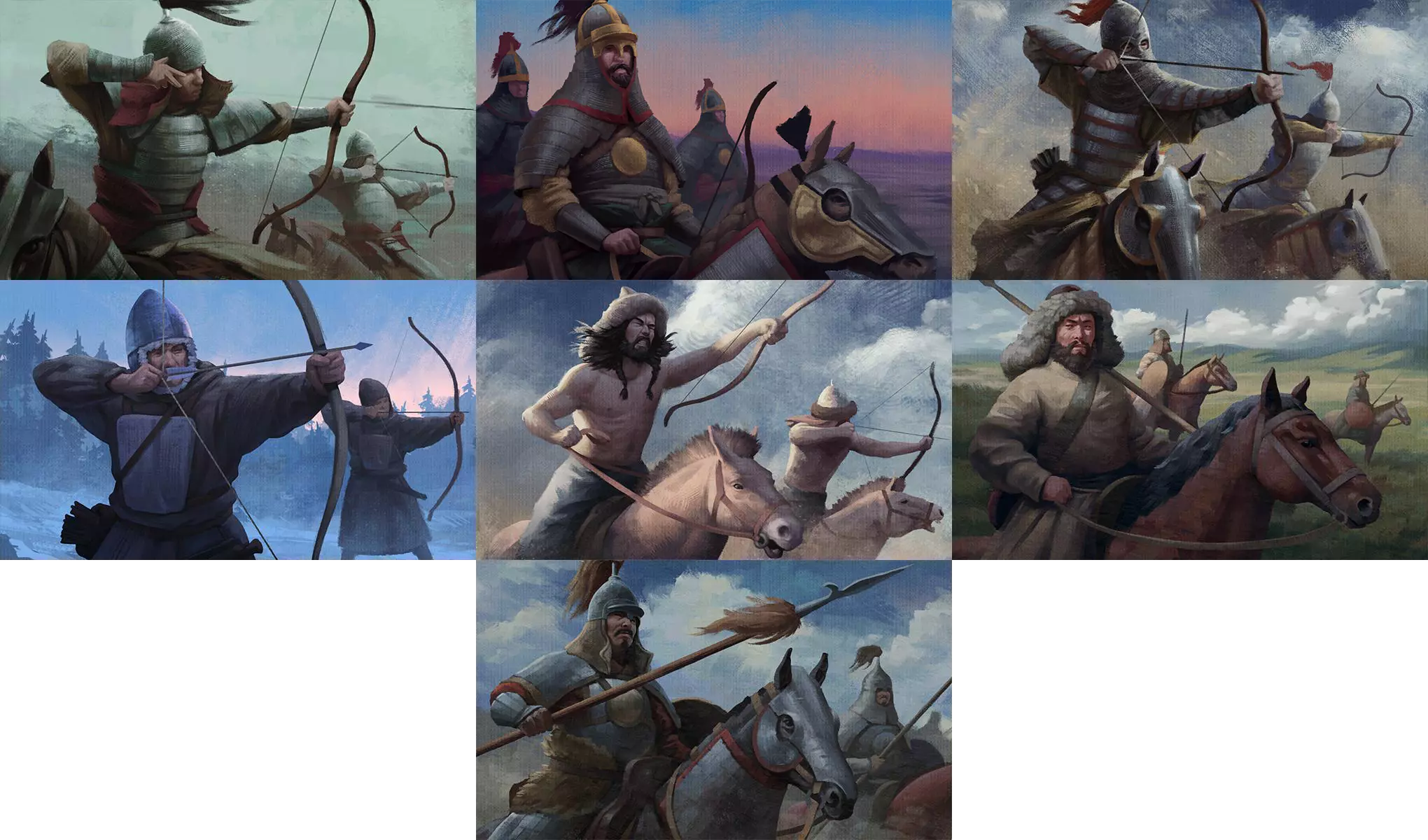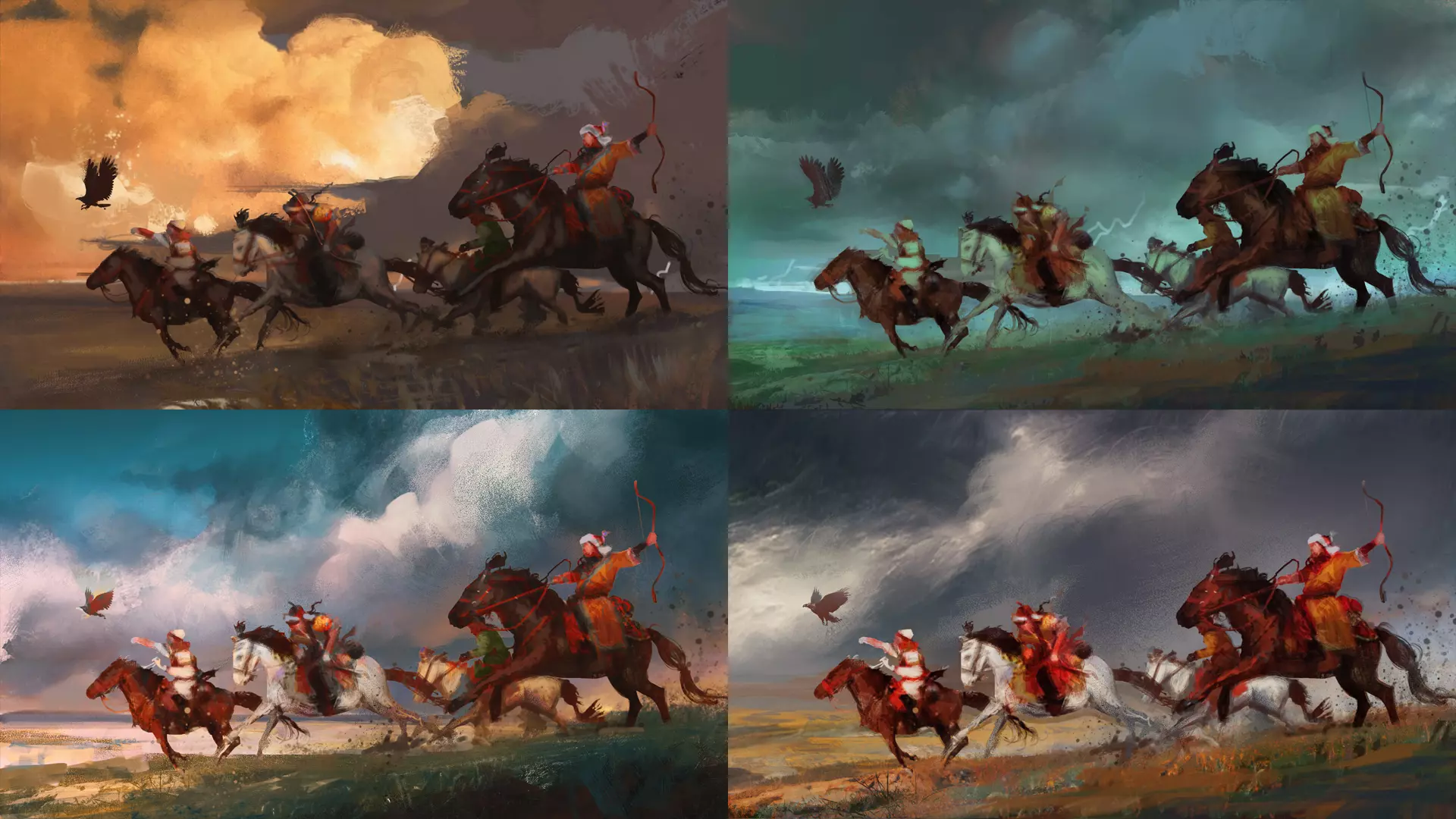 在这4个方案中,我们选择了那个描绘战士队伍在风暴天空下冲锋的版本。我们觉得这个构图充满动感,与我们目前制作的其他加载画面相比显得尤为独特。战士队伍在风暴天空下策马前行的画面,暗示了自然与草原游牧民族生活方式之间的紧密联系。