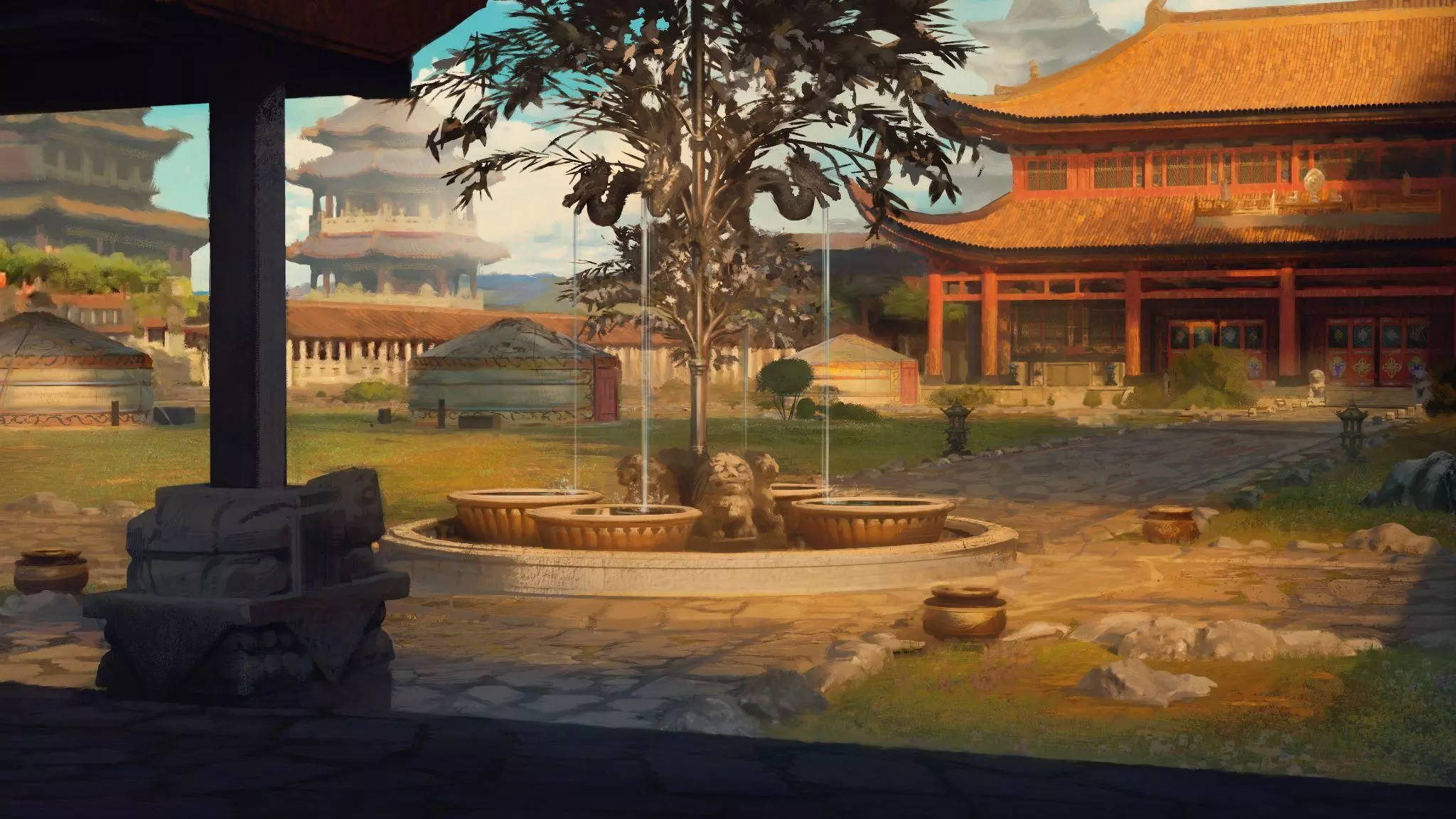 居所界面 与《权路》中的冒险者营地和行政庄园类似,游牧民族拥有自己的居所。随着“天下”概念的提出,我们决定借此机会,以一种全新的风格来创作居所美术。我们不再以西方艺术作品为灵感,而是采用亚洲风格,运用更流畅、更松散的水墨笔触。