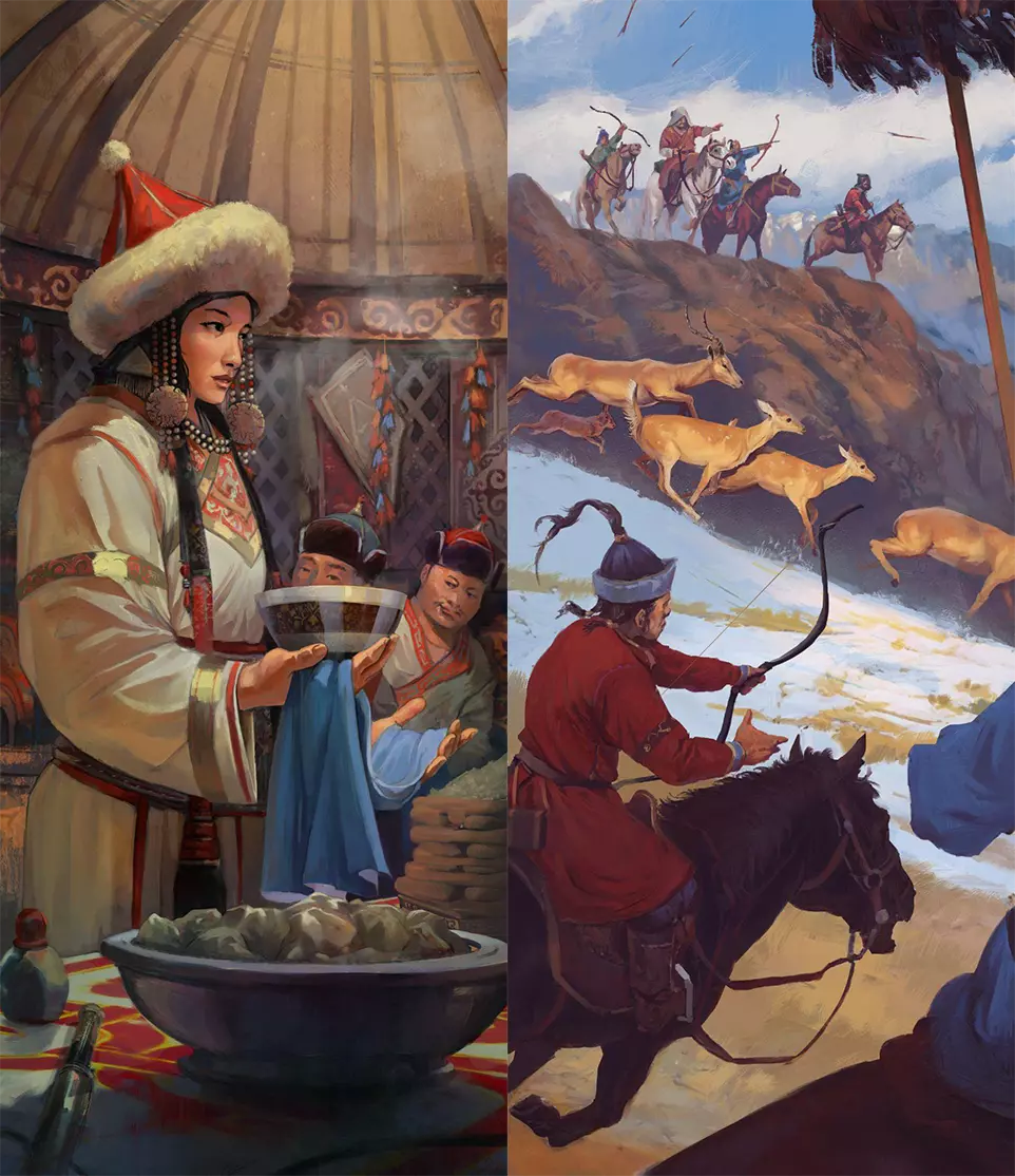 活动类型 我们为蒙古人新增了两种独特的活动类型。一种是名为【白月节】的新型盛宴,另一种是名为【围猎】的新型狩猎活动。 关于【白月节】,我们希望展现参与者身着传统白色服饰的场景。碗碟和装满美食的篮子体现了食物的丰盛,画面中也呈现了向可汗进献礼物的传统习俗。 在【围猎】活动中,骑手们会协同合作,将整个地区的动物驱赶到一起,当猎人队伍形成严密包围圈后,对这些动物进行最终猎杀。我们通过人物在画面中的布局来呈现这种包围场景:动物们仓皇逃窜,而猎人们则分列两侧。