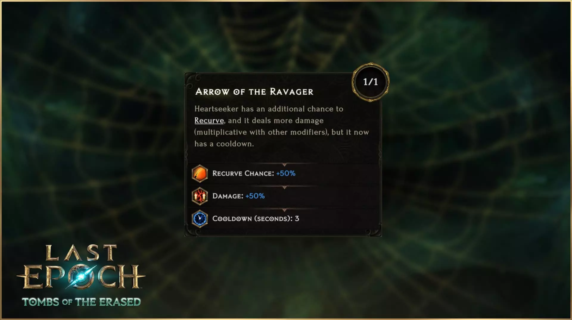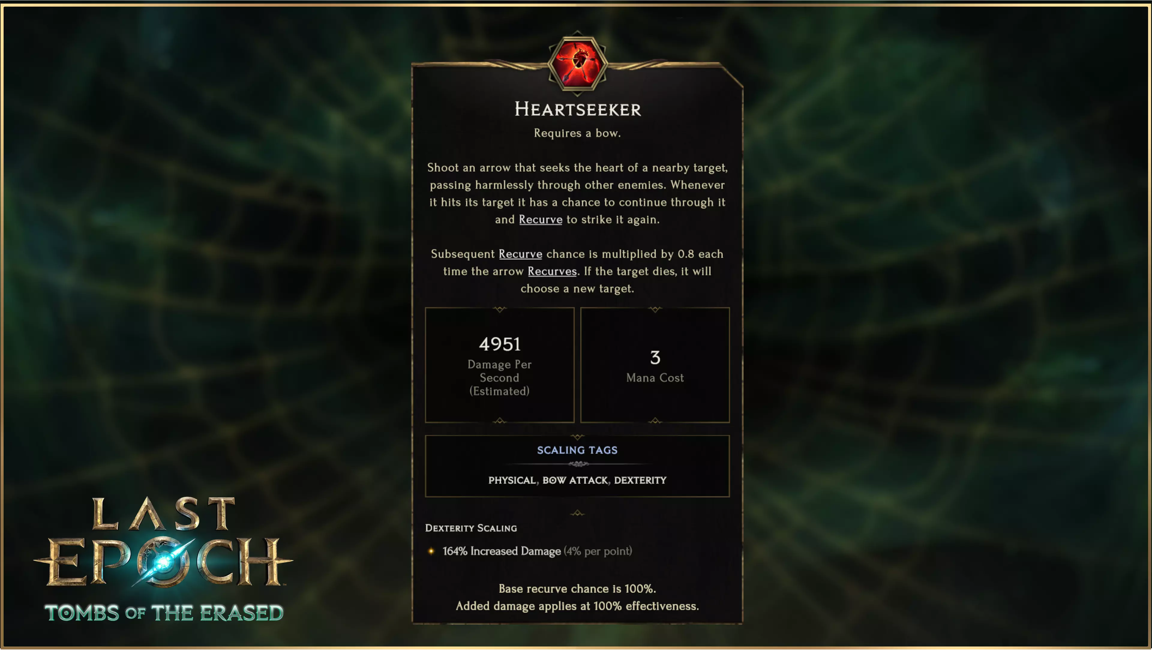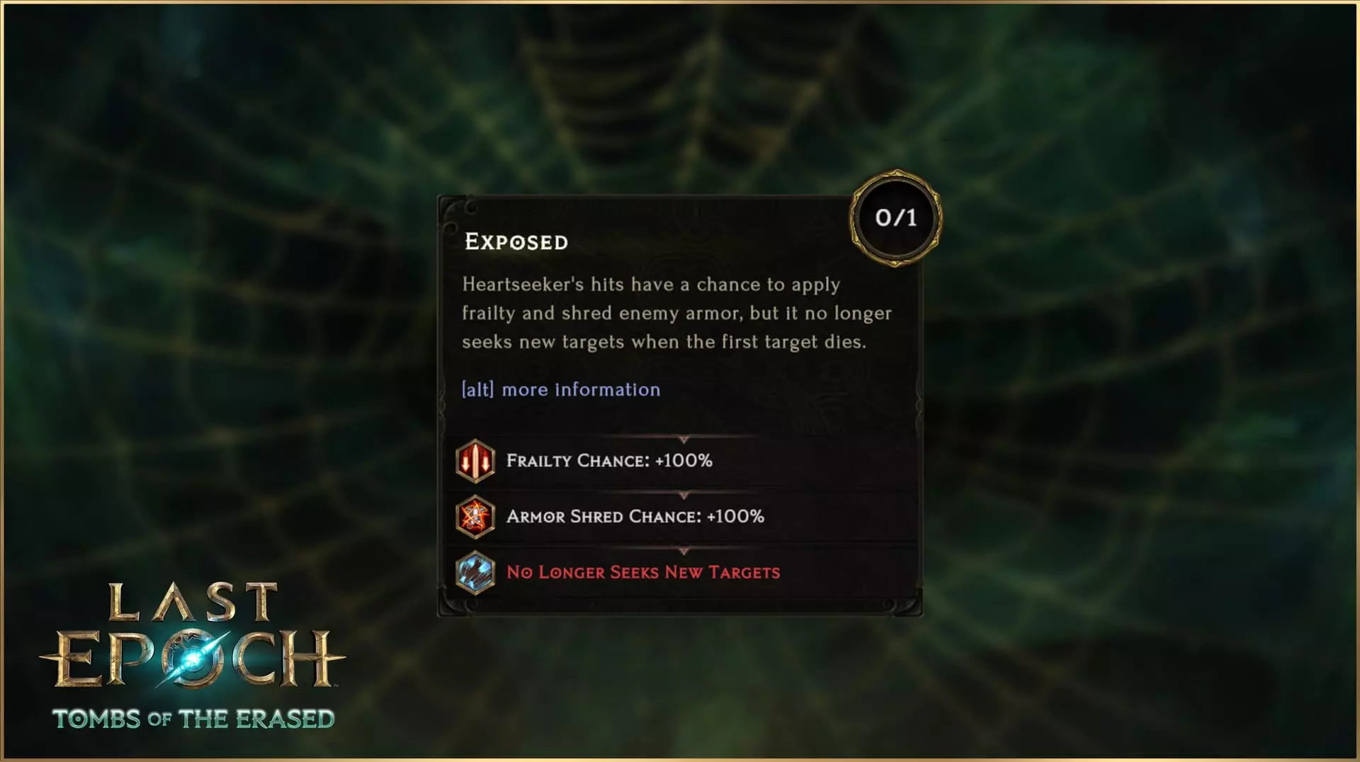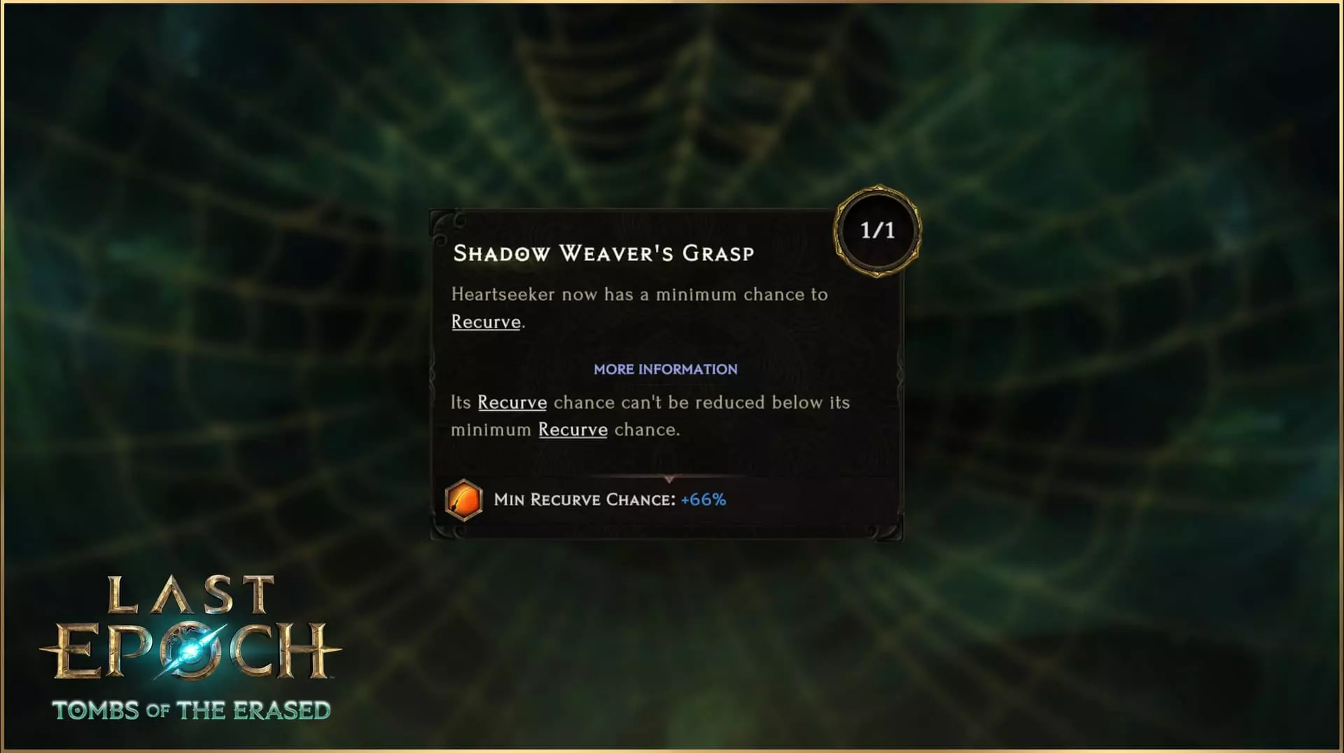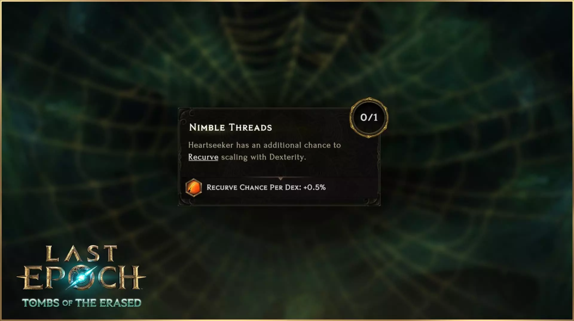 射出一支会自动追踪附近目标要害的箭矢,它会无害地穿过其他敌人。每当箭矢命中目标,都有一定几率穿透目标并【反曲】再次攻击该目标。每次【反曲】后,后续的【反曲】几率会乘以0.8。如果目标死亡,箭矢会选择新的目标。 初始默认【反曲】几率为100%,每次【追心箭】击中敌人,其【反曲】几率就会乘以0.8。这意味着在基础状态下,它必定会【反曲】一次,第二次【反曲】的几率为80%,第三次为64%,以此类推,直到未能在剩余几率内成功触发。通过提高【反曲】几率,每次使用该技能的最小【反曲】次数也会增加。例如,当反曲几率为125%时,默认情况下至少会触发2次反曲;当反曲几率达到157%时,则至少会触发3次反曲。有一个特定节点可以让追心者投射物“理论上”持续反曲,直到不再有目标为止。 专精 与《最后纪元》中的所有技能一样,追心者拥有完整的技能树,让你可以对该技能进行深度专精。这不仅限于简单的数值变化,你还可以改变其行为,以强调你希望该技能发挥的确切作用:专注于反曲几率以最大化重复命中次数,触发穿刺以“分享伤害”给其他敌人,或者结合上述两种方式。 织影者之握