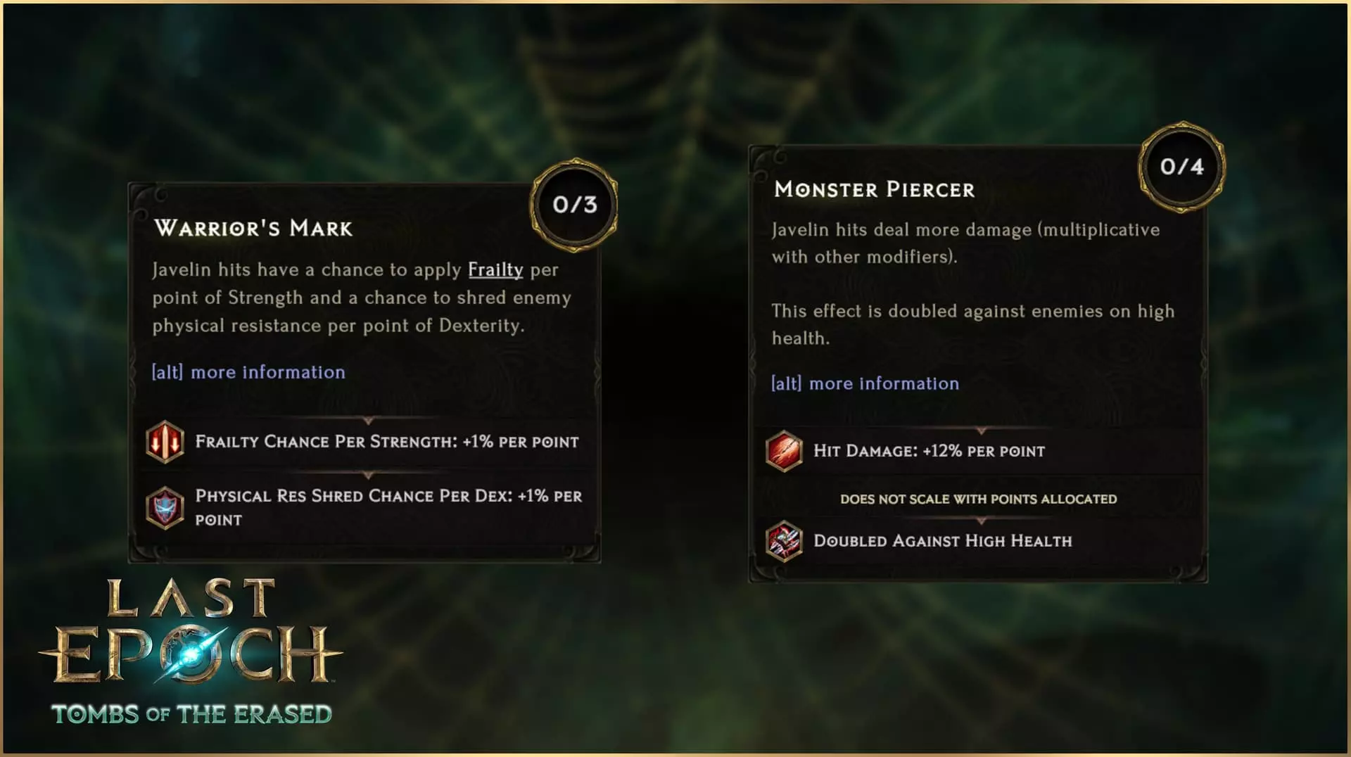 标枪 标枪的附加伤害效率已从200%提升至250%,但标枪最大的改动体现在其技能树节点上。这包括【神圣狂怒】不再与【攻城弹幕】互斥。当同时点选这两个节点时,每一支落下的标枪都会生成闪电长矛。此外,许多节点都进行了调整,以增强标枪流派的强度,并弥补【不稳定反转】改动带来的影响。