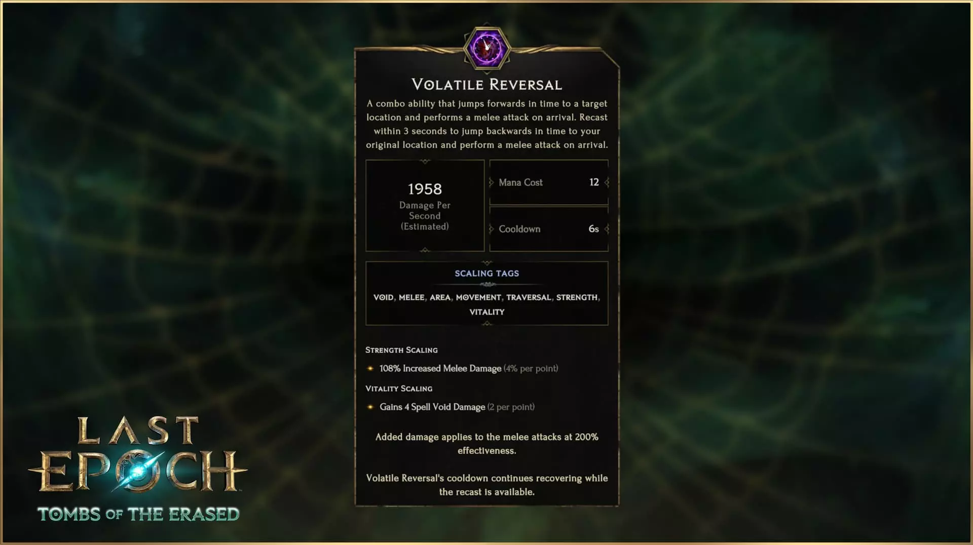 一种连击技能,可向前跃迁至目标位置并在抵达时发动近战攻击。3秒内再次施放可回溯时间至原位置,并在抵达时发动近战攻击。 不稳定逆转不再是辅助法术,而是以近战位移连击技能的身份华丽回归。作为一个两段式连击技能,不稳定逆转允许你传送至敌人身边,发动范围近战攻击,在再次激活并回溯时间返回原位置前还能进行后续操作。或者,如果你对当前战斗状态满意,也可以选择不再次激活技能,保留你全新的“未来前进版”自己(旅人因未返回而产生的衰老影响未知)。