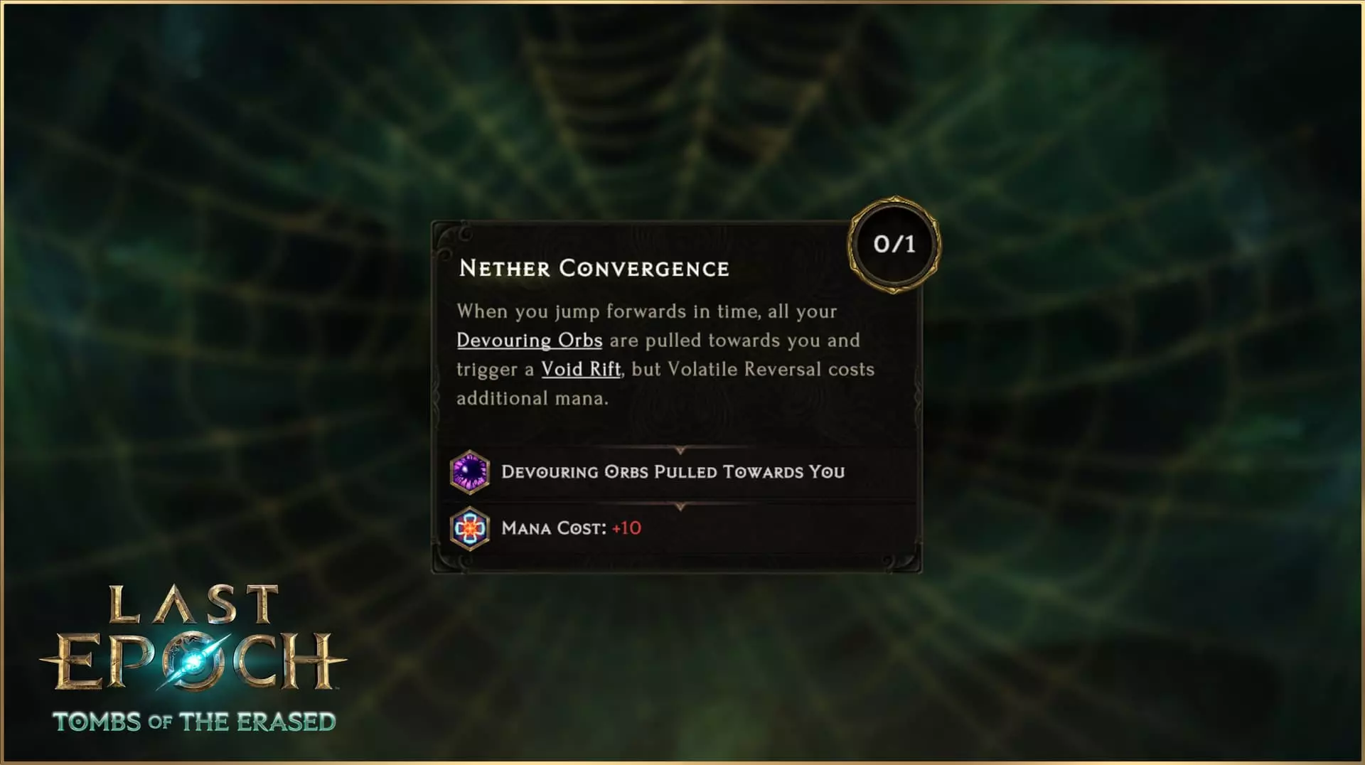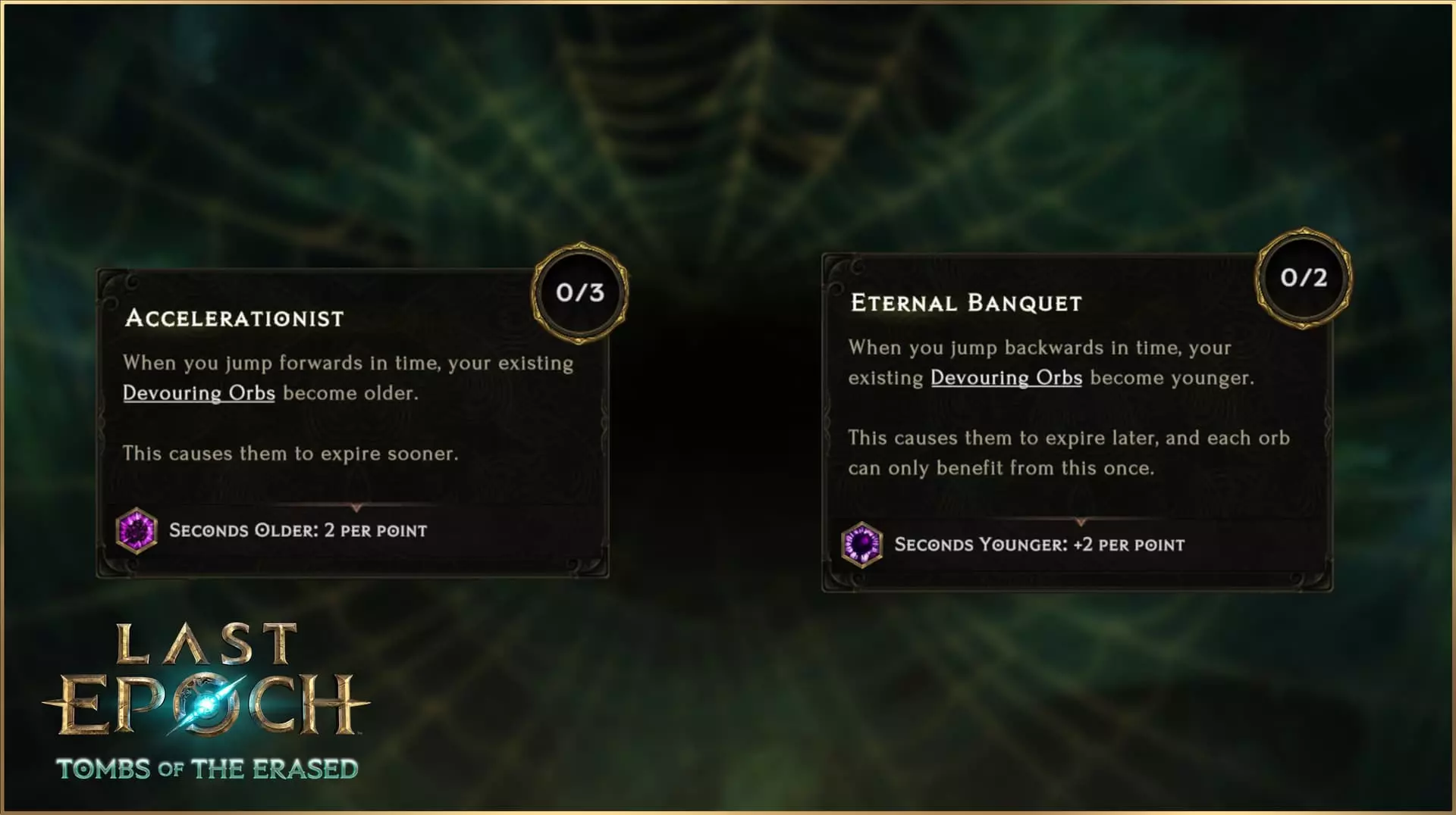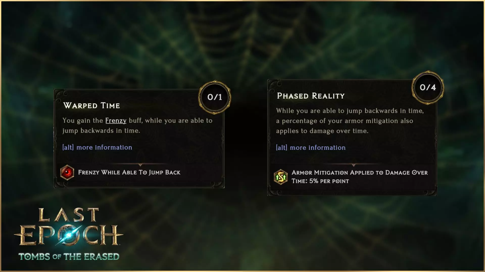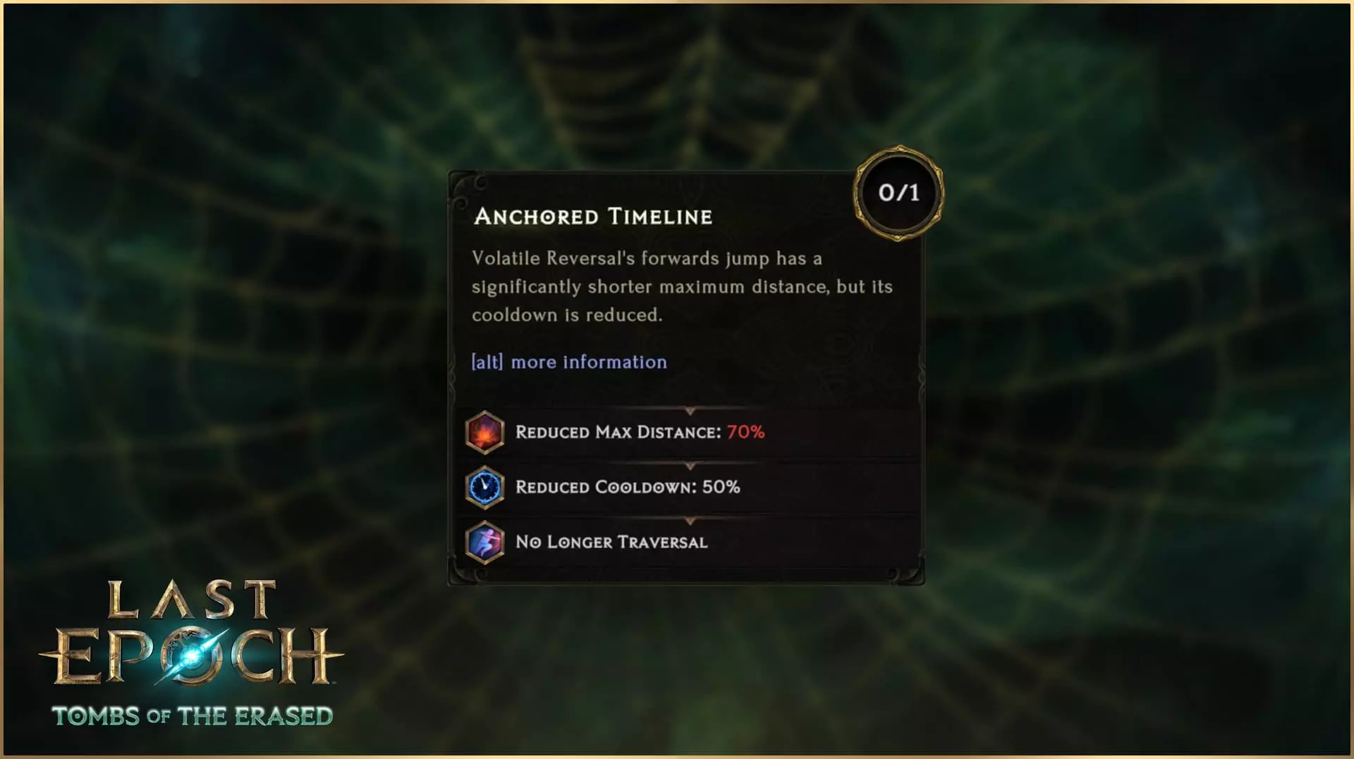 说到投掷,我们别忘了在《最后纪元》中,技能树并非修改技能的唯一途径。你将在第二赛季中找到的一件新暗金装备是【掠夺者飞镖】头盔。这件暗金装备从根本上将【追心箭】从弓类攻击转变为投掷攻击,并提供多项其他加成,但代价是一次只能激活一支【追心箭】。 更进一步 当然,【追心箭】的强化并不仅限于上述修改。你会在【追心箭】的技能节点中发现其他效果,包括消耗暗影来释放额外的【追心箭】攻击、让【追心箭】掉落黑箭,以及提供流血几率、中毒几率、暴击几率和暴击倍率的节点,还有其他叠加的反曲弓加成。在第二赛季中,潜行者将以全新方式让敌人感受痛苦并畏惧阴影。你觉得自己能让追心箭触发几次反曲效果? 哨兵技能重做 除追心箭外,第二个经过重做且本质上属于全新技能的【不稳定逆转】将在第二赛季首次登场。这一改动是有原因的,因为哨兵和不稳定逆转此前并非不受欢迎。实际上,不稳定逆转曾非常受欢迎,但并非出于好的原因。 当前版本的不稳定逆转提供了非常强大的全局加成,因此几乎成为所有哨兵build的核心技能。虽然拥有辅助能力本身并无问题,但不稳定逆转具有非常独特的机制——将玩家传送回过去。由于玩家更多地是为了其被动全局加成而非机制效果才使用该技能,这使得该技能处于一种不健康的状态——因其强大的效果,许多玩家觉得必须使用它,但同时使用起来又常常缺乏乐趣,甚至“令人厌烦”,因为玩家们只想要增益效果,而不想被回溯时间。 因此,我们计划对【不稳定回溯】进行重做已有一段时间。然而,由于【哨兵】职业几乎是被【不稳定回溯】所支撑,若将其重做为一个更具独特趣味性的技能,而非一个无趣的辅助增益,会导致许多【哨兵】的技能选择变得过于弱势。因此,在第二赛季中,我们将把【不稳定反转】重做为一个全新技能,它将拥有全新的技能树和机制。同时,我们还将对许多哨兵技能和被动技能进行大量增强和调整,以帮助整个艾特拉世界的哨兵们不再严重依赖单一技能,能够独立作战。