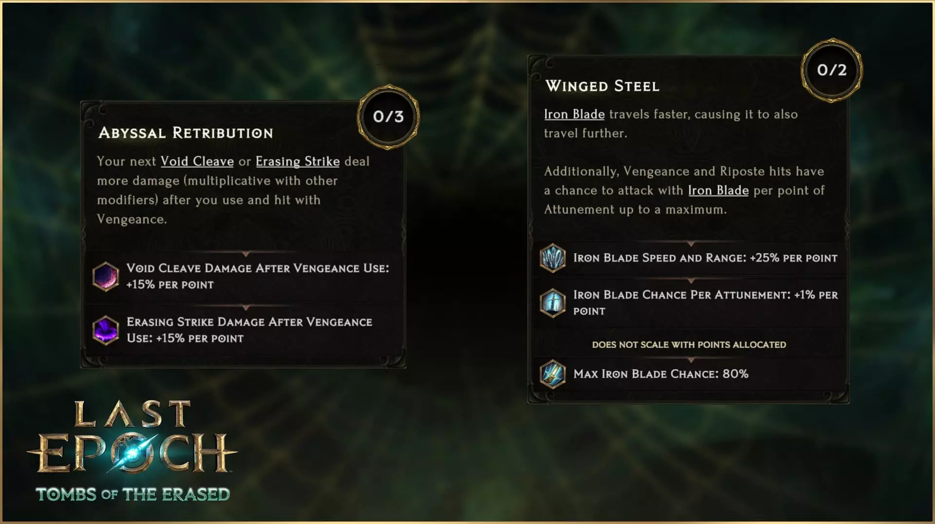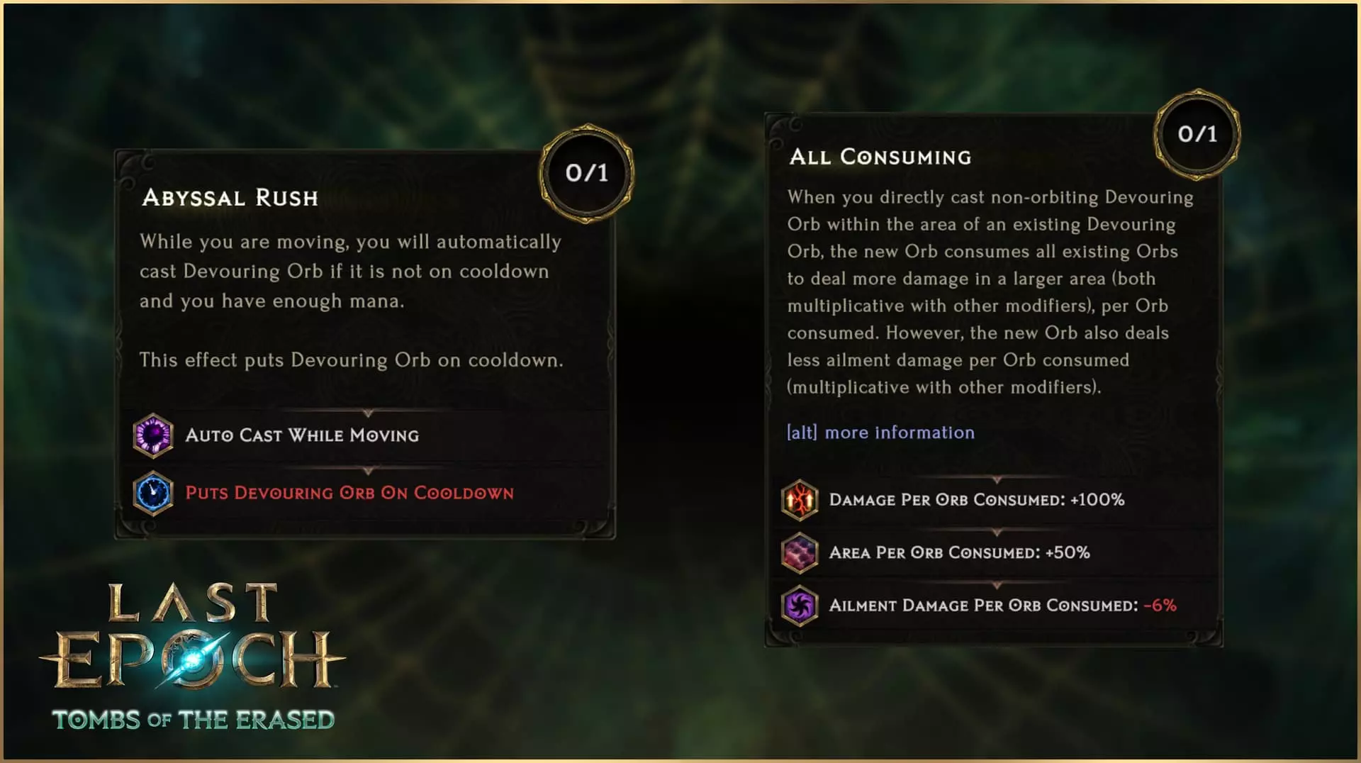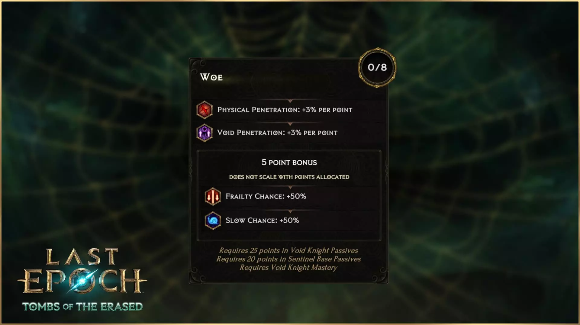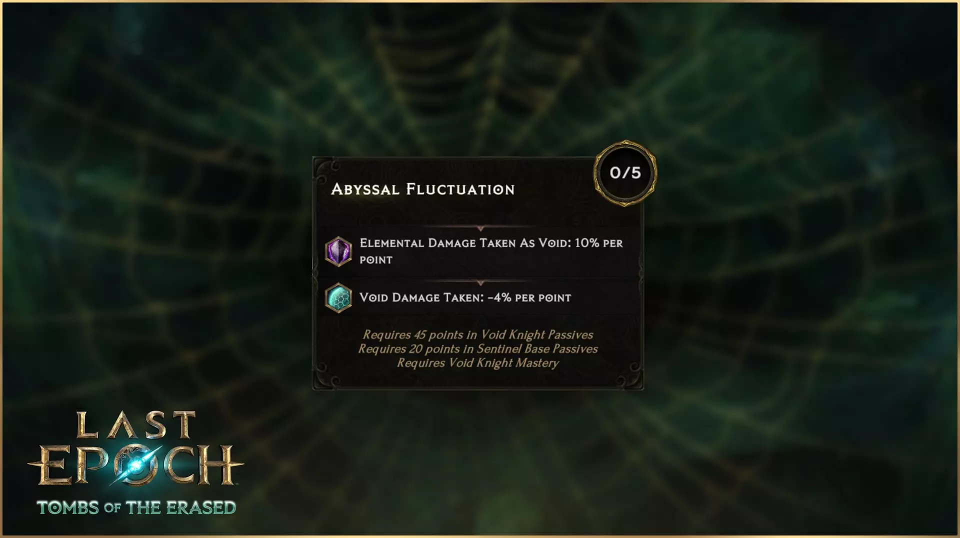 与虚空骑士主题相契合,调整后的【灾厄】节点提供带有减速和虚弱几率的阈值加成。将其与经过改动的【恐惧形态】被动技能相结合——该被动能减少你受到的减速效果——你将能更好地掌控自己和敌人的时间流逝。 深渊波动 你在死亡状态下造成零伤害。深渊波动为虚空骑士提供了一种强大且符合主题的减伤方式,最多可将50%的元素伤害转化为虚空伤害,并减少所有受到的虚空伤害(包括转化后的伤害)。
