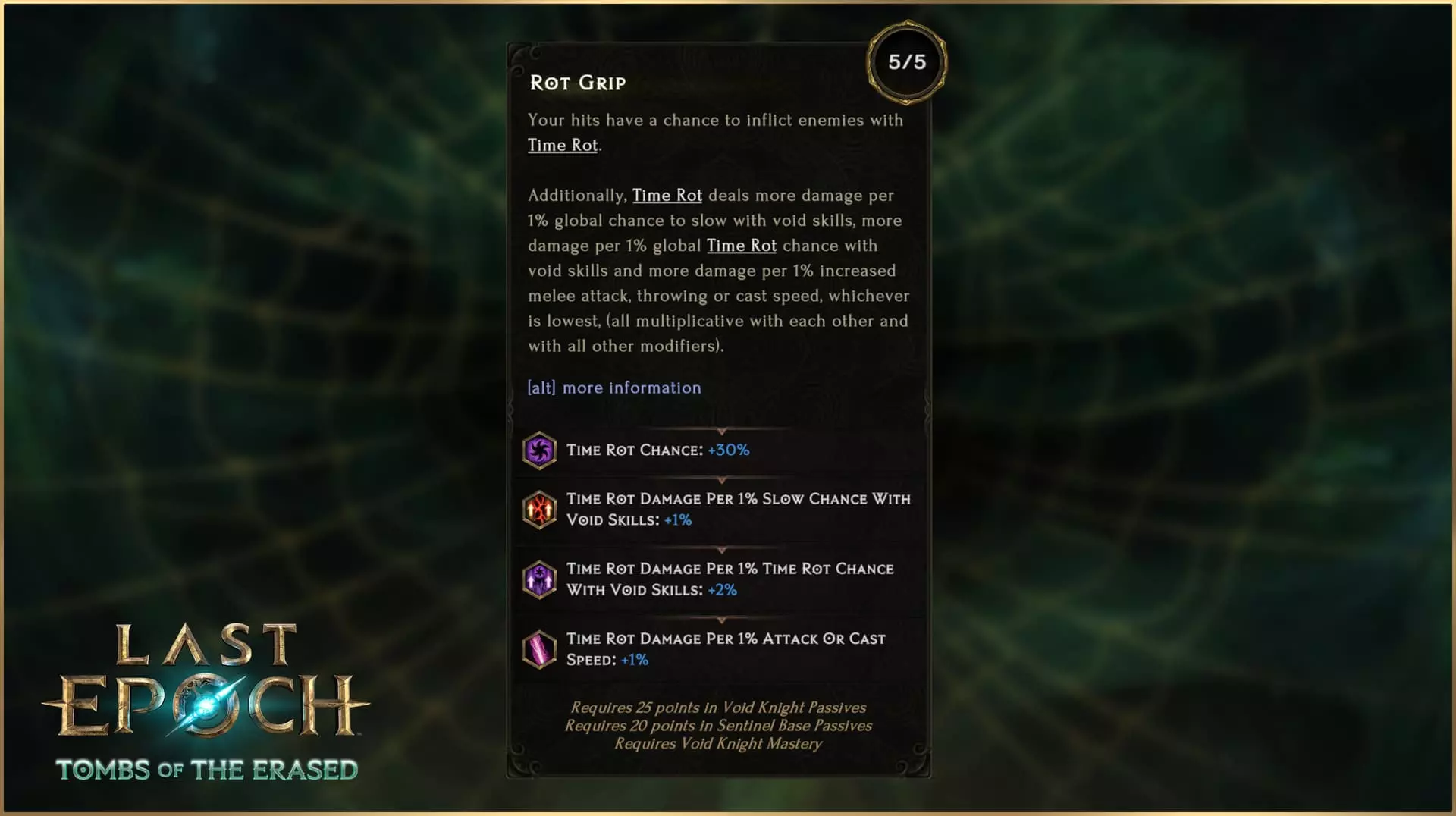 当然,被动生成印记(Sigils)以前是暗金装备【奥rian的太阳封印】的专属能力。这让很多人问:“这件暗金装备现在有什么用?”答案是:【奥rian的太阳封印】现在会提高你被动获得符文(Symbols)的速率,并提供一个“断路器”机制——当你的生命值低于耐力阈值时,会激活希望符文(Symbols of Hope),自动消耗当前的符文以获得防御和进攻加成。 时间腐朽 简而言之:时间腐朽现在是虚空骑士(Void Knights)的一个可行Build流派。时间腐朽是一种持续伤害效果,造成60点虚空持续伤害,使眩晕持续时间增加5%,持续3秒,最多可叠加12层。虽然大多数持续伤害效果都依赖于尽可能高的叠加层数,但不要因此而对新的时间腐朽望而却步。随着许多新来源能够稳定施加时间腐蚀,以及新出现的时间腐蚀强化被动,例如极为强大的虚空骑士腐蚀之握被动,时间腐蚀除了堆叠层数外,还提供了其他的强化途径。