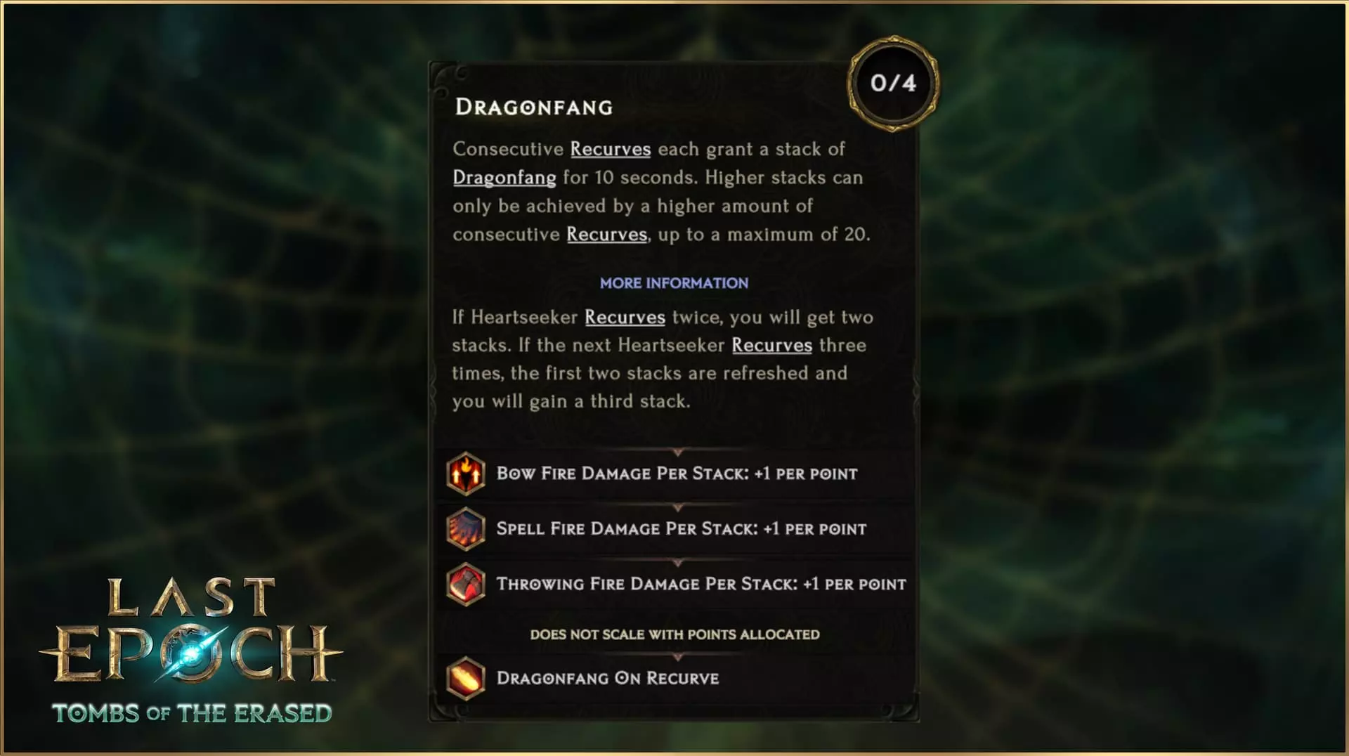 或者,将追心者转化为火焰属性,即可获得龙齿效果,为弓类、法术和投掷攻击提供可叠加的额外火焰伤害。龙齿是一种增益效果而非技能修饰符,这意味着你造成的所有弓类、法术或投掷伤害都将受益于这部分额外伤害。但请注意,只有最高的反曲次数才有效:你不能简单地堆叠攻击速度来充分利用这个节点,你需要单个追心者反复反曲以获得更高层数的龙齿,最高可叠加20层,总计为弓类、法术和投掷攻击增加80点火焰伤害。