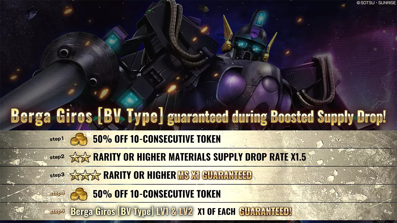 ■活动时间 [太平洋时间] 2025年10月16日 01:00 – 2025年10月22日 21:30 [已计划] [中欧夏令时间] 2025年10月16日 10:00 – 2025年10月23日 06:30 [已计划] ■活动内容 本次补给箱活动中,可进行最多5阶段的10连补给箱抽取。 每进行一次抽取,阶段将提升1级,依次为阶段1→阶段2→阶段3→阶段4→阶段5。 阶段5完成后,限时提升补给箱活动结束。 ・阶段1(15代币):代币50%折扣! ・阶段2(30代币):★★及以上材料掉落率1.5倍! ・阶段3(30代币):必出1个★★★及以上稀有度MS! ・阶段4(15代币):代币50%折扣! ・阶段5(30代币):必出贝尔加·吉罗斯[BV型] LV1和LV2! ※抽取内容与当前正在进行的补给箱相同详情请查看【道具列表】。 ※请务必查看活动日程,以免错过任何内容。 ■GBO秋季庆典④-5:特别阶梯补给箱Vol.3+ 自[PDT]2025年10月16日/[CEST]2025年10月16日起,特别阶梯补给箱Vol.3+将开启。
