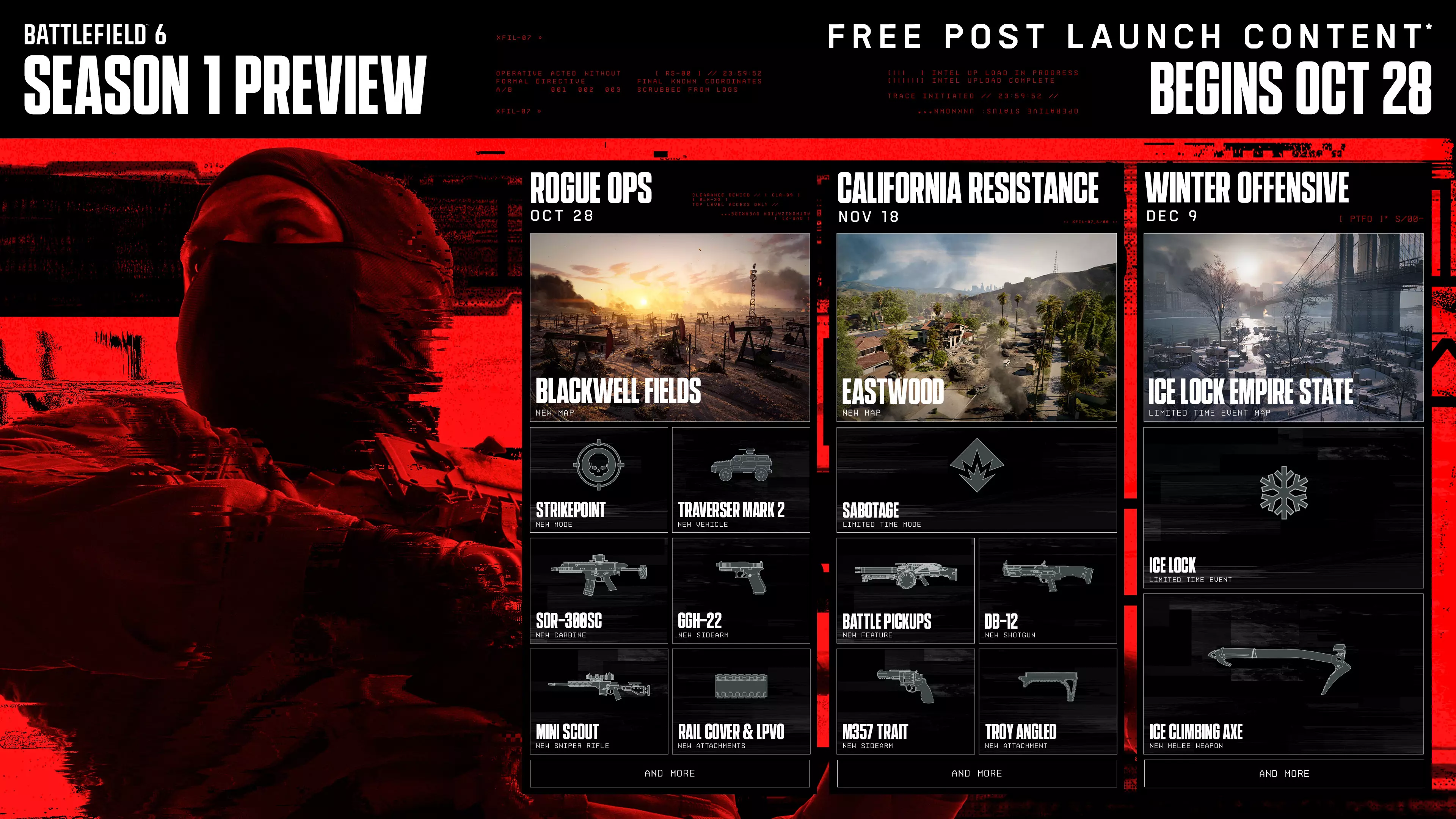 每个赛季,我们将每月推出全新内容:从第一季开始,玩家可以期待新地图、武器、模式、载具及其他特色内容,这些内容不仅会增强《战地风云6》的多人游戏体验,创作者也可通过门户构建工具将其添加到社区体验中。 10月28日,首个赛季“侠盗行动”正式开启,在这一体验中,小队将需运用智慧,在新地图“布莱克威尔田野”上争夺胜利。 11月18日,本土的美国联盟在“加州抵抗战”中迎难而上,将战场推进至“伊斯特伍德”。 12月9日,“冬季攻势”带来的极寒将纽约州笼罩在大雪之中,战争的局势再次发生转变。虽然我们很快会分享更多关于第一赛季的内容,但以下是目前你需要了解的所有信息: 秘密行动 - 将于10月28日推出