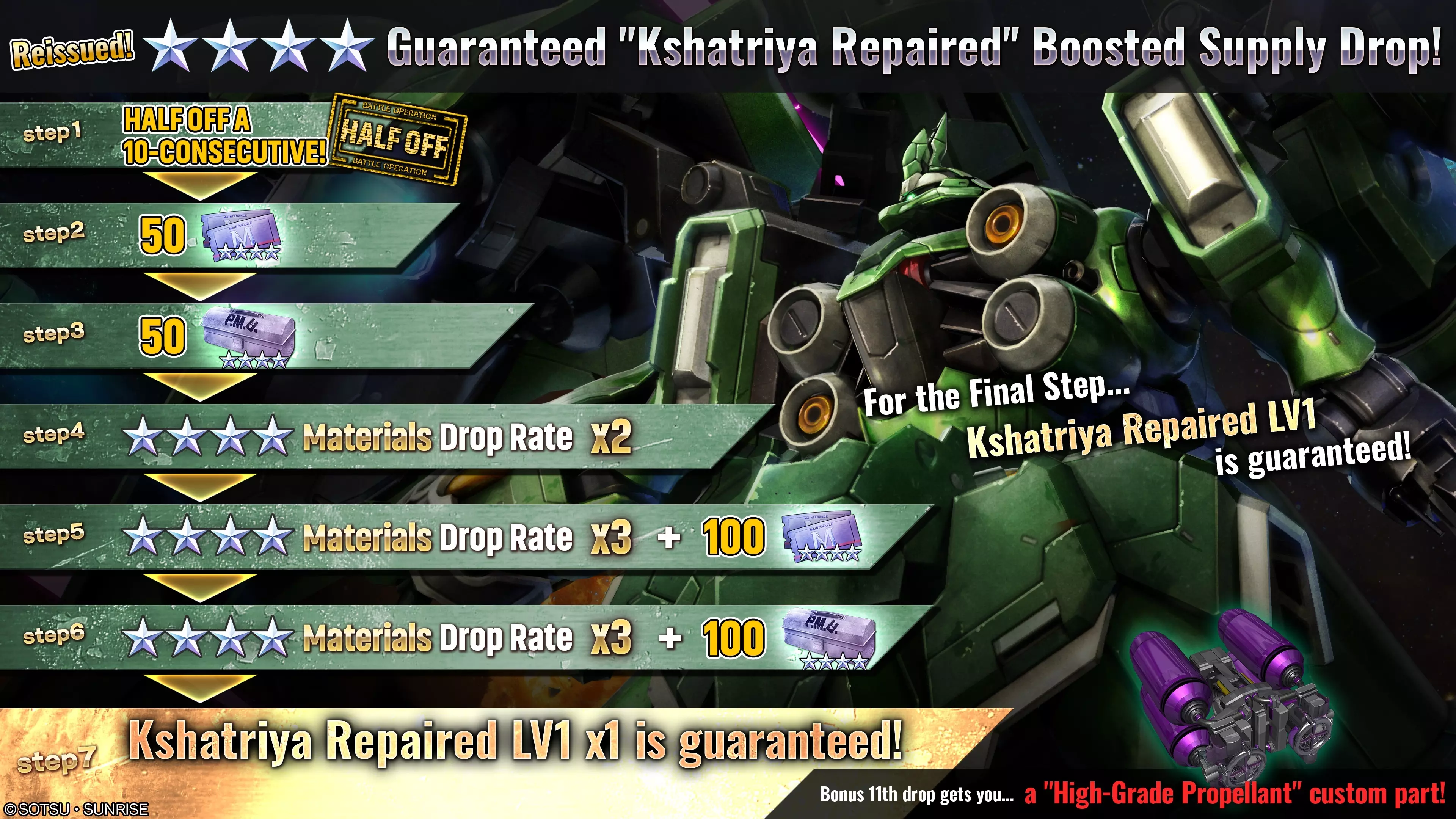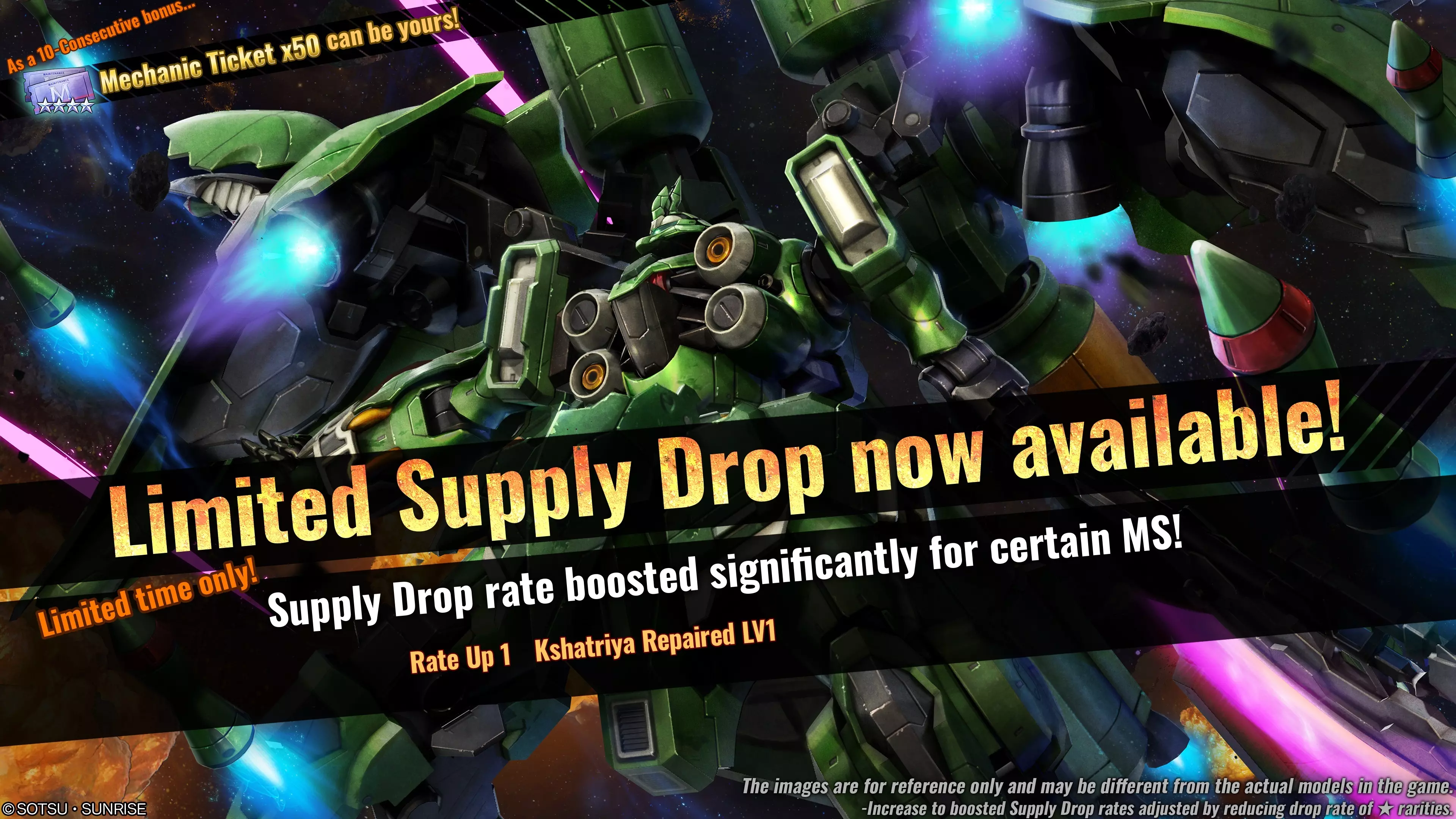 ■活动时间 [PDT] 2025年8月7日 01:00 – 2025年8月13日 21:30 [已计划] [CEST] 2025年8月7日 10:00 – 2025年8月14日 06:30 [已计划] ■活动内容 活动期间,可在物资柜台请求【限定补给箱(单次/十连)】。 限定补给箱中,【Kshatriya Repaired】的掉落率将提升。 此外,进行十连补给箱请求时,将额外获得50张【★★★★机械师票】作为奖励。 ■大幅提升补给掉落率的重点物资 限定补给箱中,仅目标单位的掉落率会受到影响。◎补给掉落率提升①(物品数量1) ・★★★★ 刹帝利修复型 LV1(通用机体,可在地面/宇宙使用,cost:700) ■受掉落率提升影响的补给 ・限定补给 ※本次限定补给可获得的素材与当前普通补给的阵容相同。与标准补给不同,限定补给中仅指定物品的掉落率会提升。 ※关于限定补给的详细阵容,请查看【物品列表】。 ※请求限定补给所需的代币数量与普通补给相同。(1次 – 3代币 / 10次 – 30代币) ※请务必查看活动日程,以免错过任何内容。 ■“GBO DAYS”概览 我们的大型活动“GBO Days”将于每个月第一个周四至周日(JST)期间举办多项活动!