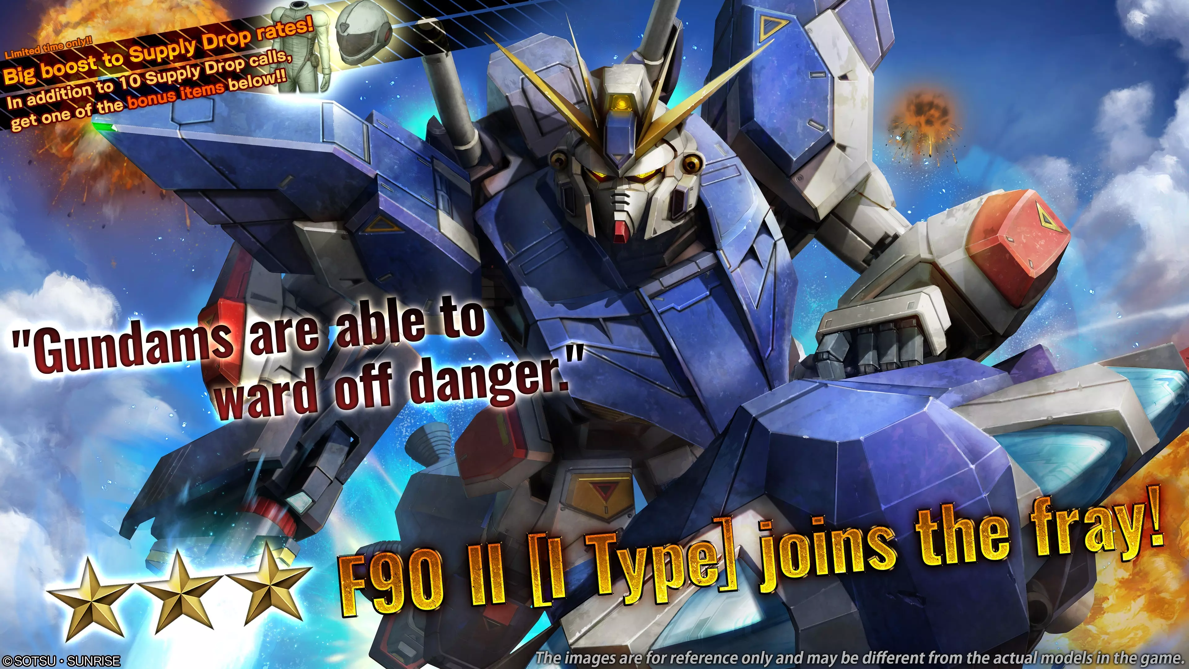 ■活动时间 [PDT] 2025年8月7日 01:00 – 2025年8月13日 21:30 [已计划] [CEST] 2025年8月7日 10:00 – 2025年8月14日 06:30 [已计划] ■含额外物品的补给箱 普通10连补给箱 ■额外物品内容(从以下列出的2个物品中随机获得1个) ■服装 普通套装:联邦F01 ■配饰 头盔:联邦F01 ※活动期间进行10连补给箱抽取,将额外获得第11个补给箱,并得到1个额外物品。 ※单次补给箱不适用此福利。 即使连续进行10次单次补给箱抽取,也不会获得额外物品。■其他材料 ■机体 ・★★–★ 贾姆鲁芬 LV3–4(支援型机体,陆战/宇宙战通用,cost:600-) ・★ 吉姆狙击型特装 LV4(支援型机体,陆战/宇宙战通用,cost:450)