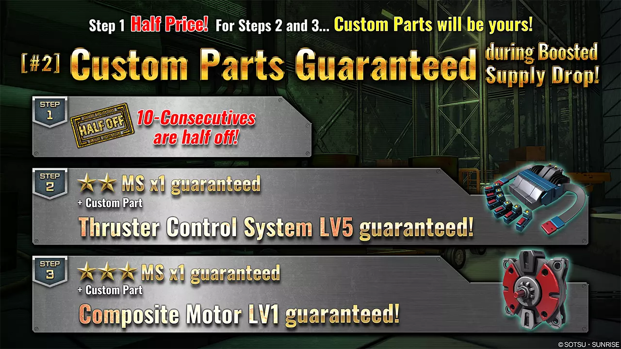 ■活动时间 [PDT] 2025年8月7日 01:00 – 2025年8月13日 21:30 [已计划] [CEST] 2025年8月7日 10:00 – 2025年8月14日 06:30 [已计划] ■活动内容 补给箱活动,最多可请求10连补给箱至第3阶段。 每次请求后阶段将提升1级,顺序为阶段1→阶段2→阶段3。 达到阶段3后,强化补给箱活动结束。 ・阶段1(15代币):代币50%折扣! ・阶段2(30代币):额外获得自定义部件【推进器控制系统LV5】!并保证获得1台★★机体! ・阶段3(30代币):额外获得自定义部件【复合马达LV1】!并保证获得1台★★★机体! ■自定义部件 推进器控制系统LV5 推进力提升15。高速移动期间减少5%的推进器消耗