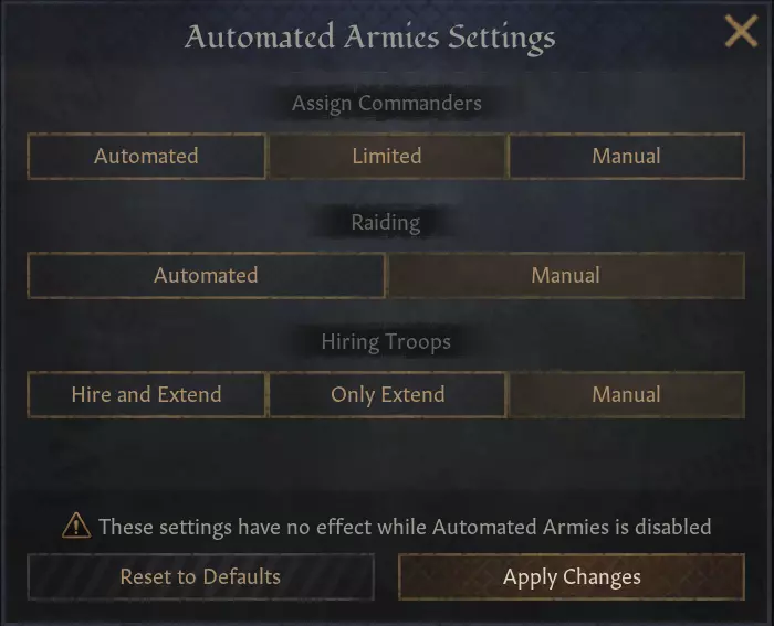 【自动军队设置】 要让这项功能良好运行,有两个关键部分:了解AI的想法,以及确保AI表现出色。自动军队与AI的常规玩法并无区别,因此对其中一方的改进也会提升另一方。以下两个部分将涵盖这两个方面: AI盟友信息 有时在战争中,你对盟友的想法一无所知——他们可能只是原地待命、行动混乱,或者总体上帮不上忙。这通常是因为存在一些你没有意识到的情况,比如他们正在补充军队补给,或者正在守卫某个围城等。为了让军队的行动更加透明,我们添加了带有描述的图标,明确告诉你人工智能正在做什么。