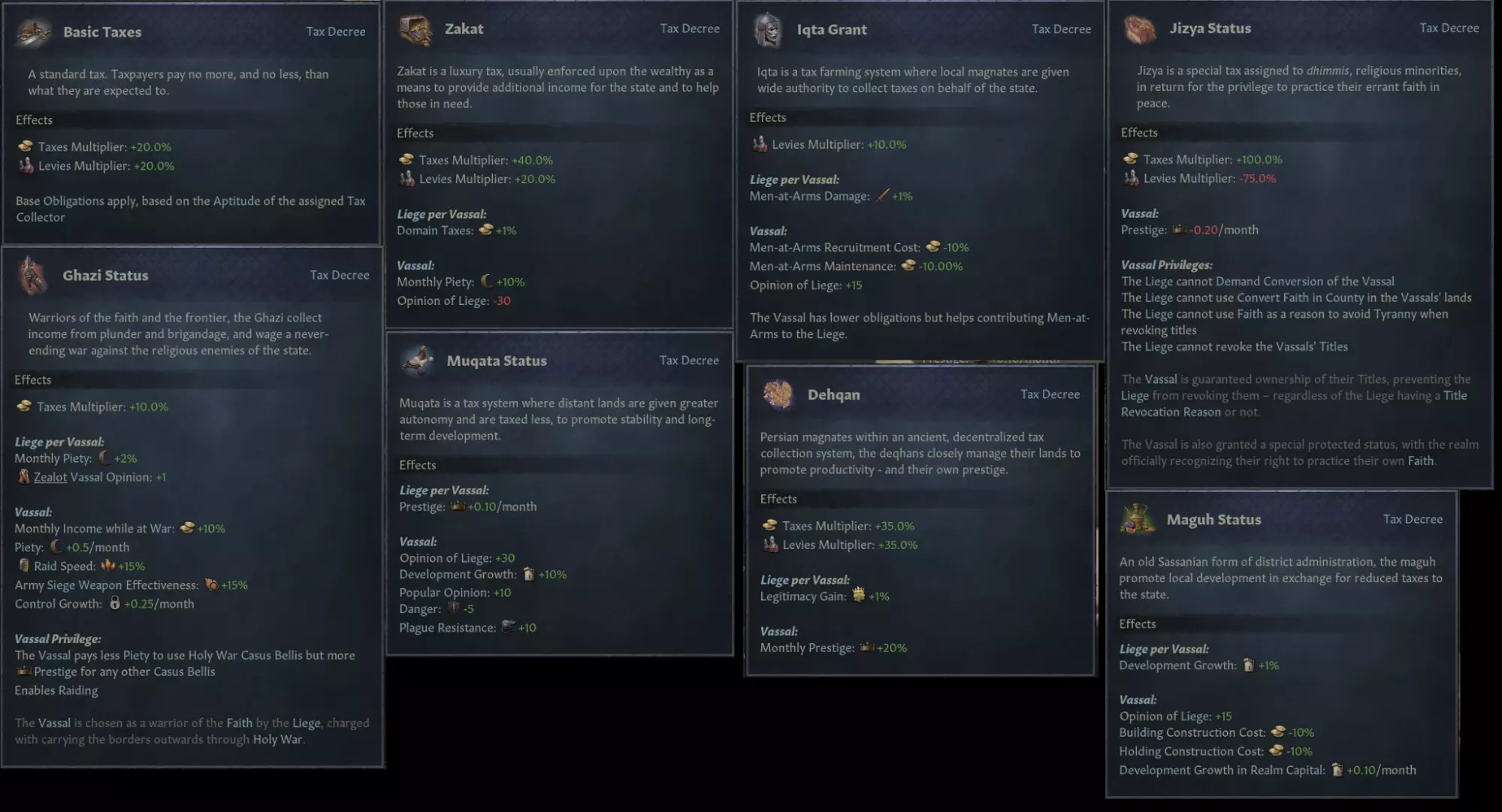 【更新的税收法令】 所有税收法令均已更新,具备更有趣且现代化的效果,其中包含自税收法令添加以来新增的系统,如正统性、危险度和瘟疫抗性,同时启用了与法令逻辑相关的系统,例如为加齐进行劫掠。 这些改动符合部族领地更不稳定的特性,提供了更具相关性和趣味性的选择加成。如今,它们应能更接近封建领地通过封臣契约所能聚集的力量。 【分级指挥官特质】 所有指挥官特质现均为分级特质,可通过执行与特质相关的行动来提升等级。