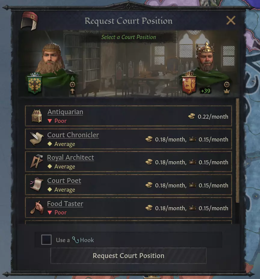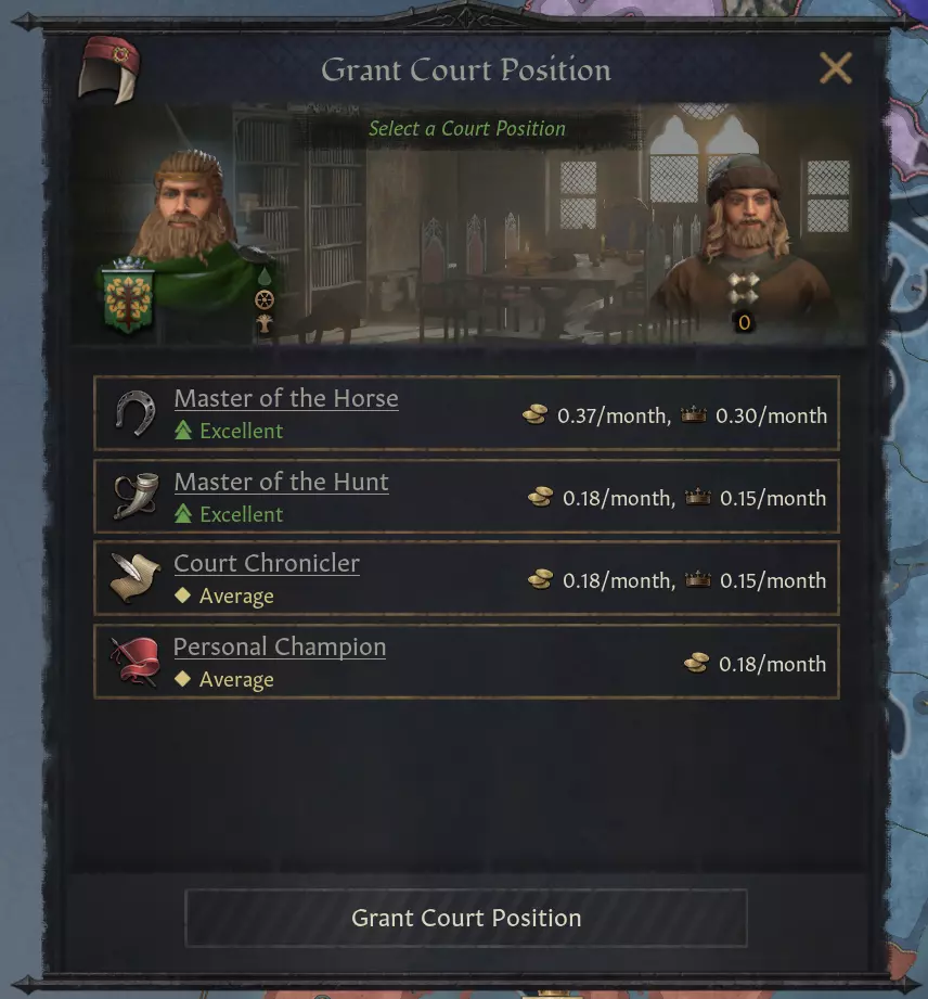 大家好! 本期开发者日志将介绍即将推出的免费更新,我们将其命名为1.15.0“皇冠”!与以往的免费更新类似,皇冠更新内容相当丰富,包括系统重制、新功能以及大量错误修复和平衡性调整。 我接下来要介绍的所有改动,都源于我们在并行开发过程中,会投入大量时间来更新、调整现有系统和功能,并修复相关漏洞。根据各个开发分支的进度,该分支的开发人员会被分配参与我们所谓的“领域维护”工作,专注于改进那些我们认为不够完善,或者社区玩家要求我们进行修改的游戏内容。通常,新开发阶段开始时会有大量领域维护时间,因为在例如概念设计或预制作阶段,新开发内容中的漏洞较少。在领域维护期间,我们会安排改进日,尽可能添加许多小改进和生活质量优化,同时也会花时间打磨黑熔炉游戏创作赛(我们内部的一种游戏创作活动,用于试验《十字军之王3》的新功能)中前景良好的项目。皇冠更新包含了超过4个月的领域维护成果,其中包括200多个漏洞修复。 我没有时间详细介绍所有内容,所以我将重点介绍几个亮点!宫廷职位重做 去年我们预告了宫廷职位的重做计划,从那以后我们对其进行了优化并增加了更多改进。简而言之,此次重做旨在让宫廷职位更具趣味性和吸引力,具体包括添加新工具、调整成本、提升使用体验,以及优化用户界面使其更易用。我们的目标是通过赋予宫廷职位新的效果和任务,使其能够应对多种不同情况,从而让更多玩家使用它们。