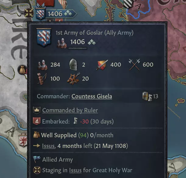 【图片 - 展示自动化逻辑】 在上图中,右侧军队正在积极围攻,而左侧军队则在一个拥有足够补给上限的省份驻守以防御围攻。 AI有多种不同的状态表现:移动、攻击、前往围攻、支援玩家等。希望这能解释大部分关于AI行为的疑问,否则它们的某些行为可能显得难以理解。 warfare AI修复/更新 我们在warfare AI方面做了大量工作以改进它。我们不承诺创造奇迹,但我们投入了超过两个月的程序员时间来修复漏洞、改善欠佳的行为,并调整那些虽为预期但感觉“不对劲”的行为。这包括许多AI犹豫不决、消极被动或在省份间“徘徊”的情况,这些情况通常是由各种相互竞争的系统试图避免损耗、使补给上限与部队规模匹配以及边缘案例错误导致的。上述修复与公开的AI盟友逻辑相结合,使得战争更加清晰,更容易理解AI的行动意图。我们还让AI了解了战争分数,使它们会追求能获得分数的目标,而不是基于一系列固定不变的情况随意选择行动。例如,当玩家进行战争时,如果你知道即将完成的围城会让你赢得战争,那么你就不太可能继续追击战斗;如果你已经达到战斗战争分数上限(通常大多数宣战理由的战斗战争分数上限为+50%),你也不太可能继续追击战斗。AI现在也更有可能使用带有攻城武器的部队进行围城,并且会尝试调整围城部队的部署,以确保正在进行的围城不会被中断。 当然,仍会存在一些特殊情况导致不希望出现的行为,我们会在发现问题后持续修复漏洞。希望你不会再过多注意到奇怪的AI行为。游戏中“常规”战争AI表现欠佳的一个领域是十字军东征期间,因此我们决定采纳社区的建议,对这些大圣战进行特殊处理。“一刀切”的理念已被摒弃,AI现在在这些大规模战争中会遵循一套特殊程序。 首先是一系列小调整:在取得一定进展之前,AI对损耗和补给的关注度降低,并且会减少“跳船”行为(选择短途海路)。当你率领一支可能多达数十万人的军队,从物资充足的欧洲乘船登陆到物资匮乏的干旱地区时,根本无法为所有人找到足够的补给——AI现在已经了解到这一点。当他们开始攻击战争目标时,会暂时忽略损耗,直到建立起足够的滩头阵地,能够支撑其部队规模为止。这使得十字军东征的初始阶段更有可能成功,因为进攻方AI不会为了寻找补给而拼命调动部队。通过减少“跳岛航行”,他们会更倾向于选择陆路前往目标,从而避免-30的优势惩罚。现在来说说这些改动的核心内容:全球战争(GHW)中的进攻方需要先找到【集结区域】,然后将他们的军队转移到【集结待命区域】。