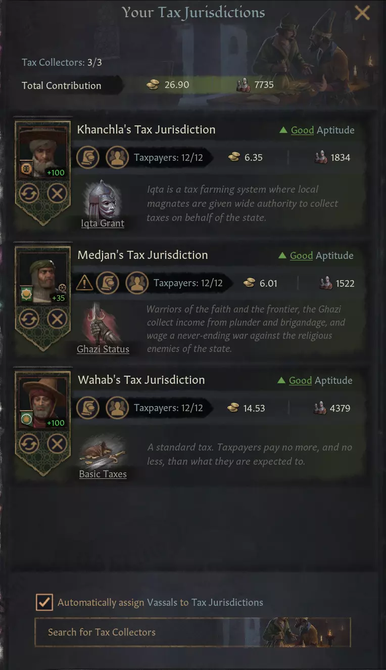 【图片 - 夺取边缘公国宣战理由】 除此之外,我们还将“下令大规模逮捕”决议重新设计为角色互动功能。现在,只要贵族家族的领地位于首都,您就可以对所有贵族家族使用此功能,而不仅限于有权势的家族。我们还调整了重建罗马帝国时的选项,例如提供无需激活罗马困难模式即可转为希腊多神教的途径,同时通过调整事件频率并移除部分不合理内容(如疾病增加),让该模式更具可玩性。 氏族政府调整 氏族政府是一种(根据遥测数据显示)游玩率较低且AI难以良好驾驭的政府类型(其表现往往明显不佳)。这促使我们考虑采取措施,让税务辖区的管理更有趣且减少挫败感——在管理税务辖区时,寻找称职的税务官一直是个难题。你所能动用的只有无地廷臣,以及一个冷却时间相当长的决策,这导致体验十分糟糕:要么找不到人可以任命,要么好不容易有人选,却往往能力很差。各种税收法令也显得效果平平,绝大多数玩家都会选择【天课】(奢侈品税),因为它能直接增加金币收入。 所有这些问题促使我们对该功能进行了一系列改动。