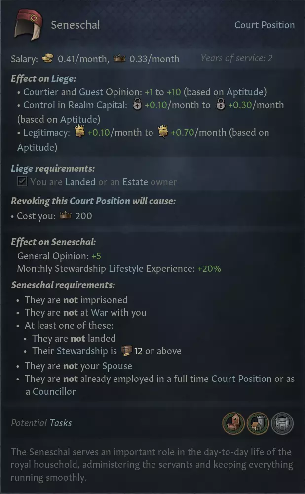 【管家工具提示】 过去,许多宫廷职位因难以承担其薪资开销而从未被启用。因此,我们决定将部分成本转移为威望消耗,同时全面下调薪资(截图中的薪资数据来自中世纪晚期,即1066年之后约150年)。威望是大多数玩家更愿意消耗的资源,但由于目前“威望消耗途径”仍较少,你需要注意避免过度消耗…… 所有新任务均有成本消耗:部分消耗威望,部分消耗金币,甚至有一些会消耗虔诚。这些任务是成本的主要来源,但它们本质上是可选的,你可以用它们来应对棘手的情况,并根据自己的需要开启或关闭。 现在大多数职位都为持有者带来了有趣的效果,例如上图中所示的20%管理经验加成。这也意味着我们开放了更多可由封臣担任的职位,这很有意思,因为: