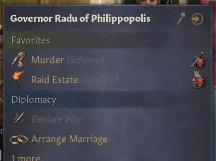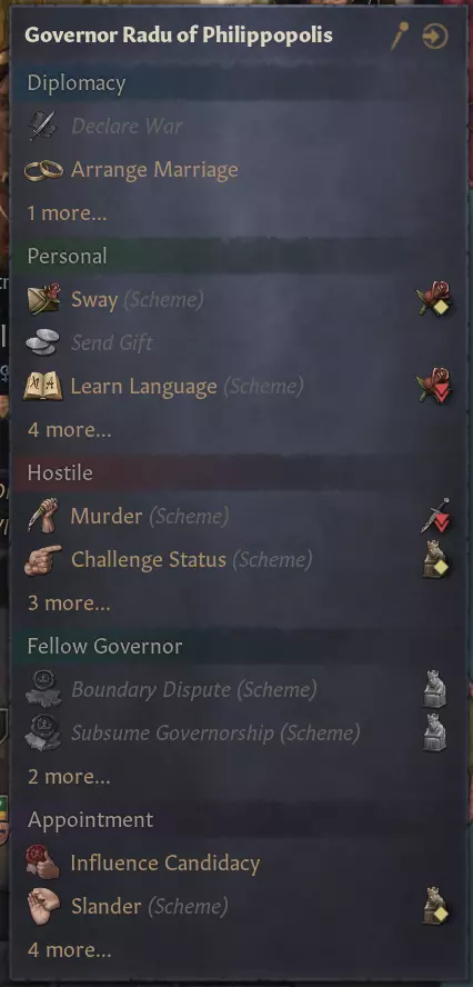 【图片 - 人工智能军队在罗马集结后于伊苏斯集结】 集结区域是距离战争目标最近的友方或中立区域,在此示例中,该区域位于拜占庭。进攻部队会先前往那里,然后再开始进攻,这意味着他们将作为一支更加统一的力量抵达。这也意味着他们不会立即从水上发起攻击,从而避免了登陆惩罚,并确保他们的部队拥有可接受的补给水平。相反,他们很可能会通过陆路进军,途中会遭受少量损耗,但最终会发起更成功的进攻。 目前,我们所做的测试表明,进攻方通常更容易成功,但仍有可能失败。不过现在他们失败的原因,不再是令人沮丧地分批多年登陆,承受着登陆惩罚且缺乏补给,而更多是因为防御方拥有本土优势——这本就该如此。 角色互动界面更新 角色互动菜单进行了翻新,旨在使其更加整洁,让互动操作更加直观。
