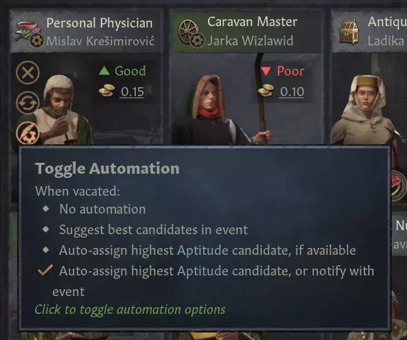 【宫廷职位自动填充】 现在,确保特定职位有人担任比以往任何时候都更加重要,我们新增了自动填充职位的选项。根据您的偏好,该功能有三种模式: 1. 触发事件,让您从宫廷中的几位优秀候选人中进行选择 2. 自动分配资质最高的廷臣 3. 自动分配,并在没有候选人时通过事件通知您 此功能可按宫廷职位单独切换,不同职位可设置不同模式。