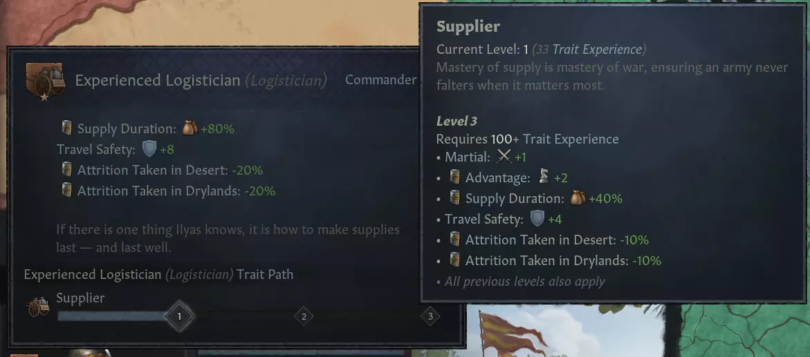【图片 - 已升级的后勤专家特性】 指挥官特性初始效果减弱,其影响力低于当前版本。现在,你可以通过战争、战斗和围城来提升特性等级——甚至可能达到以前无法企及的高度。完全升级的军事工程师可减少40%的围城阶段时间,完全升级的灵活领袖可降低80%的敌方防御加成,以此类推。 要提升特性等级,你需要进行符合逻辑的行动:例如,要提升进攻型攻击者特性,你需要赢得进攻战斗;要提升军事工程师特性,你需要完成围城,等等。指挥官的军事技能越高,其特性升级速度就越快。这也意味着拥有高等级指挥官特性的指挥官可能极具价值,因为要取代他们积累的战争知识并非易事。 理发店修复与更新 理发店已更新多个新类别,并且物品已重新调整,以提供更大程度的自定义空间。许多之前无法获取的物品已被添加,例如一些拜占庭和耆那教服饰,现在你可以自由更改眼部物品、面部物品、纹章、面纱和特殊王冠。