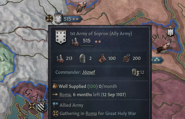 【图片 - 人工智能军队在罗马集结,准备扬帆前往耶路撒冷】 在大圣战的第一阶段,进攻方人工智能会寻找一个补给充足的区域来集结兵力。由于来自世界大部分地区的部队需要时间集结,因此他们会选择在安全的地方进行。在这个例子中,我们正在进行一场针对耶路撒冷的十字军东征,所以罗马及其周边伯爵领被认为既安全又离目标足够近,从而被指定为集结区域。你会在盟友人工智能的部队上看到一个图标,上面显示他们计划集结的地点,这样你就可以跟随他们前往那里。他们将集结数月,然后前往旅程的下一步:集结待命区。