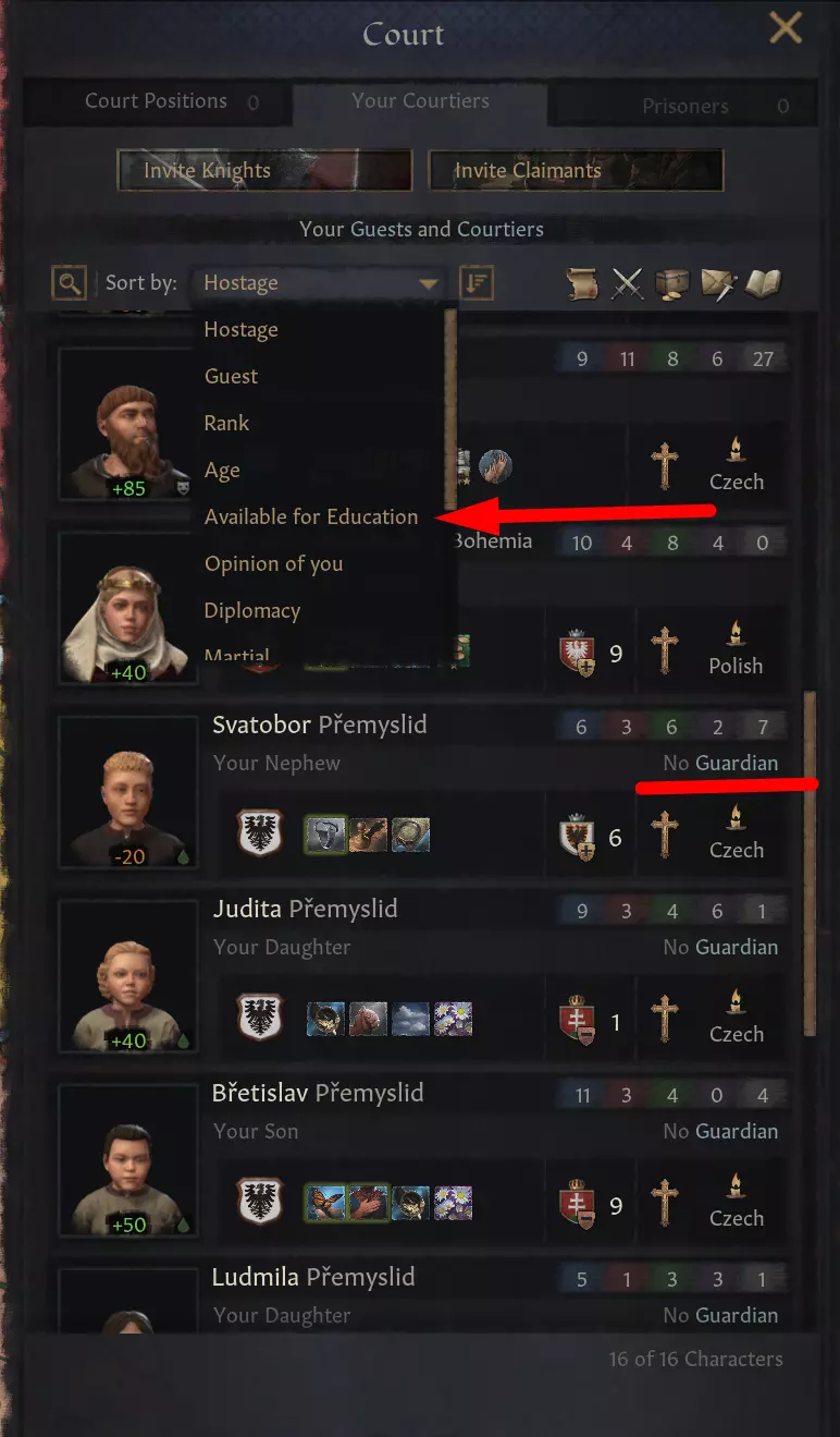 【非王朝廷臣成年】 廷臣界面中的监护人状态 现在新增了指示器文本和筛选选项,用于查找宫廷中无监护人的儿童。此功能在右侧宫廷窗口和角色视图中均有体现。