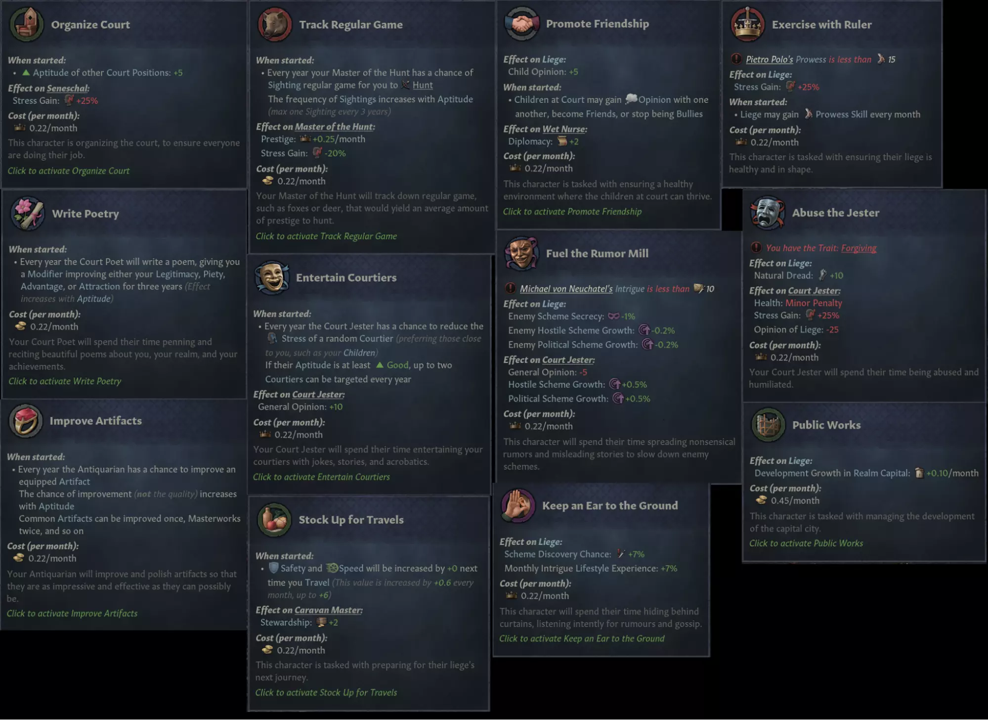 [几张新任务的截图] 宫廷职位的新任务数量太多,无法一一详细介绍,但上面展示的是其中一小部分。大多数宫廷职位现在有三个任务可供选择,少数职位有一到两个。这些任务涵盖了各种你可能需要的内容,比如奶妈向你的子女灌输美德,古董商搜寻稀有文物位置的传闻,首席施赈官提升狂热封臣的好感度等等。 现在你可以做的很多事情以前都没有对应的机制,例如减轻除你之外其他角色的压力(这可以通过弄臣的“取悦廷臣”任务来实现)。你也可以通过各种职位和任务来缓慢提升你的【正统性】;管家会提供少量的被动增长,宫廷诗人可以在【写诗】任务中提供【正统性获取百分比修正】,宫廷乐师则有【增强正统性】任务(现在公爵级角色也能任用宫廷乐师,且不再需要拥有皇家宫廷!)。需要注意的是,所有提升属性点的任务,例如【与统治者一同锻炼】,都经过平衡调整,只有担任该职位的人在某项技能上比你更擅长时,你才能获得该技能的提升。 我们还借此机会将整个【狩猎发现】系统整合到了这些任务中。如果你希望通过狩猎目击提升狩猎成功率,现在可以选择狩猎大师应专注寻找的目标——这降低了系统的随机性,让你拥有更多主动权。 自动军队 去年我们预告过的另一项功能是自动军队的加入,这是一个可选功能,由AI接管你的军队并为你进行战争。该功能的目的是让你在参与无关紧要的战争时能专注于其他事务,同时让不熟悉或对战争不感兴趣的玩家能更享受游戏。如果你是一名经验丰富的玩家,我们仍然建议你亲自指挥军队,但如果你只是要清理帝国边境的那三个伯爵领,不妨试试这个功能!