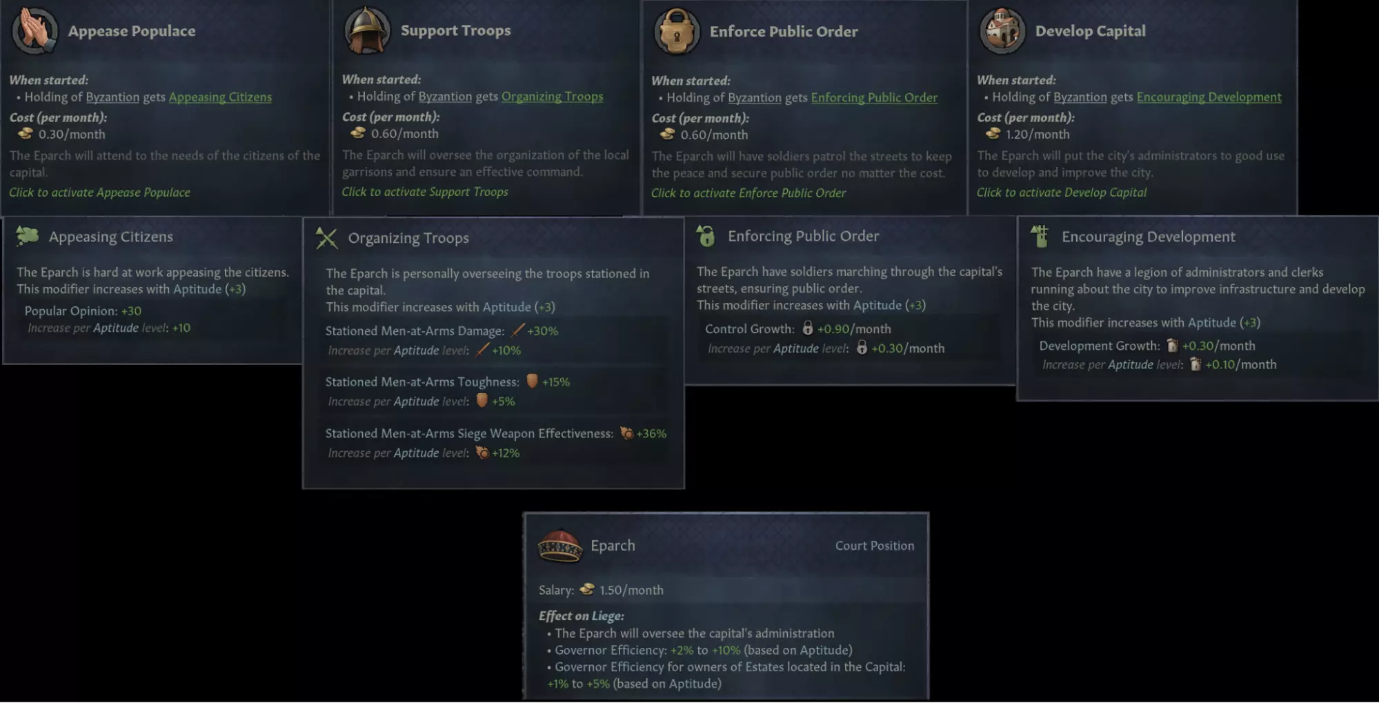 与地方行政官相辅相成的是新建筑【首都官府】,它能提升地方行政官的能力等。该建筑只能在行政领域的首都建造。