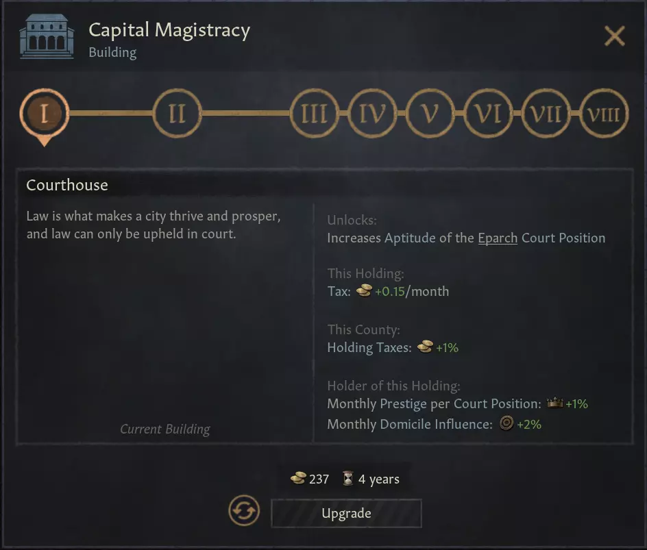 【图片 - 一级首都司法建筑】 对于行政型领域而言,并非一切都会变得更加容易——我们也认为,即便在爆发内战或势力衰弱的情况下,他们也过于轻易地就能保住自己的领地。我们新增了一个只能对行政型领域使用的宣战理由【夺取边缘公国】,允许你以极低的威望代价夺取任何位于帝国法理之外的公国。此宣战理由为进攻方提供三倍的围城和战斗战争分数,且战争分数增长速度显著加快,是从无暇他顾的帝国手中收复失地的绝佳方式。