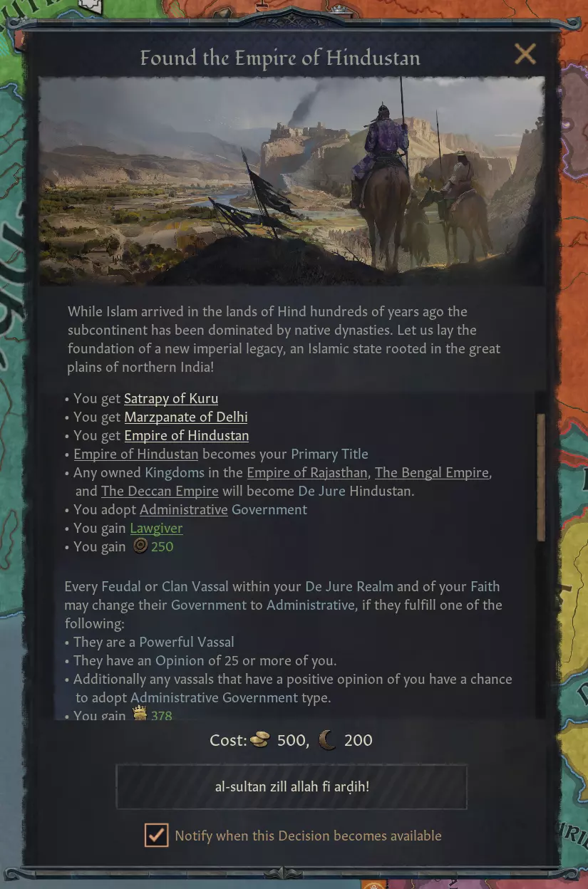 【印度斯坦创建决议】 伊斯兰对印度的征服并非在每局游戏中都会发生,但即便发生,我们也很少能看到类似真实历史上德里苏丹国的情况。新决议允许控制北方相当一部分地区的穆斯林统治者将首都迁至德里或拉合尔,同时创建一个新的帝国头衔,该头衔将包含其在三个印度帝国中持有的任何头衔。如果拥有【权力之路】DLC,还将获得行政型政府,但该政府采用世袭继承制而非选举制。 由统治者旗帜指挥