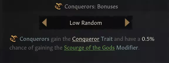 【新领域稳定性设置】 对于那些偶尔喜欢【神明的天罚:征服者】但觉得5%概率过高的玩家,我们新增了一条额外规则:低随机模式,其触发概率为0.5%。