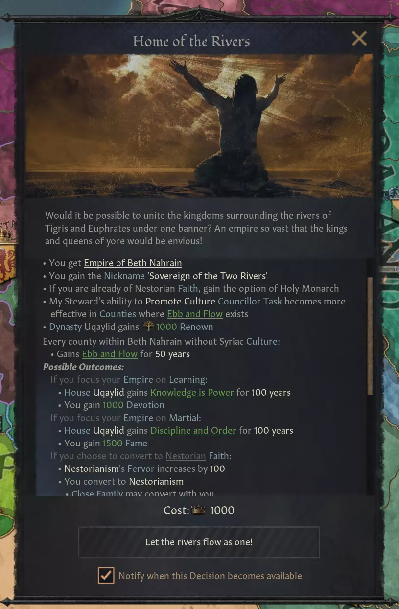 【图片 - 贝思·纳拉因创建决议】 在《十字军之王》中添加创建新帝国头衔的决议时,我们主要关注两个方面。一是为特定历史群体或地区设计有趣的架空历史帝国,例如贝思·纳拉因;二是寻找历史上真实存在但目前游戏中无法创建的伟大帝国。