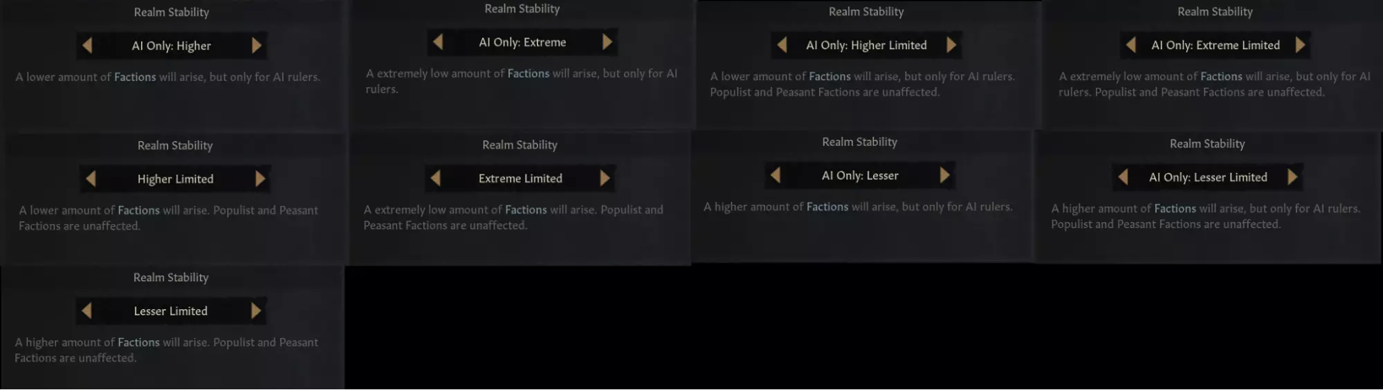 【图片 - 撒克逊人在波拉比亚地区逐步晋升】 游戏规则更新 我们根据社区反馈,为【王国稳定度】游戏规则新增了多个选项,同时还额外添加了一些内容! 1. 现在你可以将稳定度设置为仅对AI生效。 2. 新增了一个设置,用于避免改变农民派系和民粹派系的出现频率,因为根据你的设置,这些派系的出现频率可能会变得过高或过低。