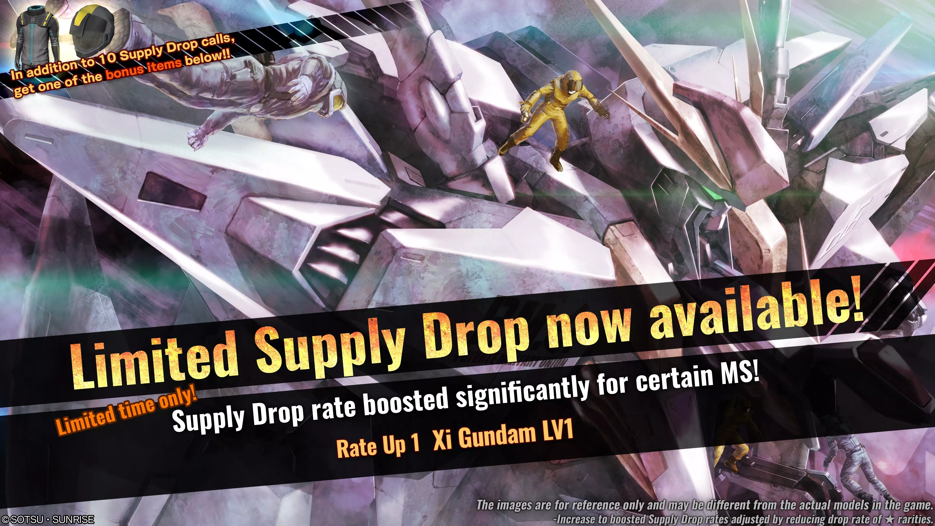 ■活动时间 [PDT] 2025年7月10日 01:00 – 2025年7月16日 21:30 [已计划] [CEST] 2025年7月10日 10:00 – 2025年7月17日 06:30 [已计划] ■活动内容 活动期间,可在物资柜台请求【限定补给箱(单次/十连)】。 限定补给箱期间,【Xi高达】的掉落率将提升。 ■补给掉落率大幅提升的重点物资 限定补给箱中,仅目标机体的掉落率会受到影响。◎补给掉落率提升①(物品数量1) ・★★★★★ 希高达 LV1(通用机体,仅限地面,cost:700) ■受掉落率提升影响的补给 ・限定补给 ■十连限定补给的额外专属机师道具奖励! 从[PDT]2025年7月10日01:00/[CEST]2025年7月10日10:00开始, 十连补给可额外获得1个随机专属机师道具。