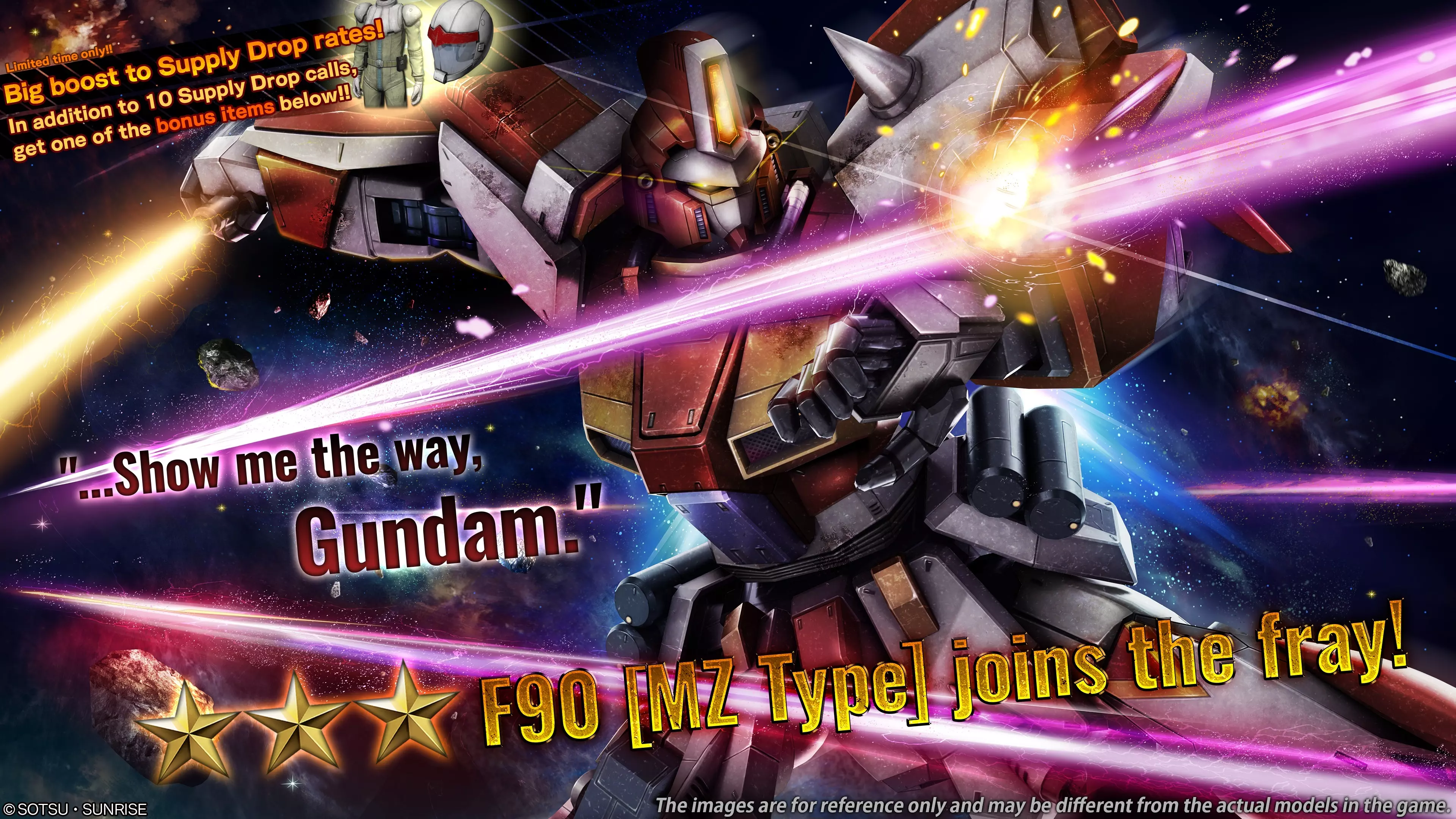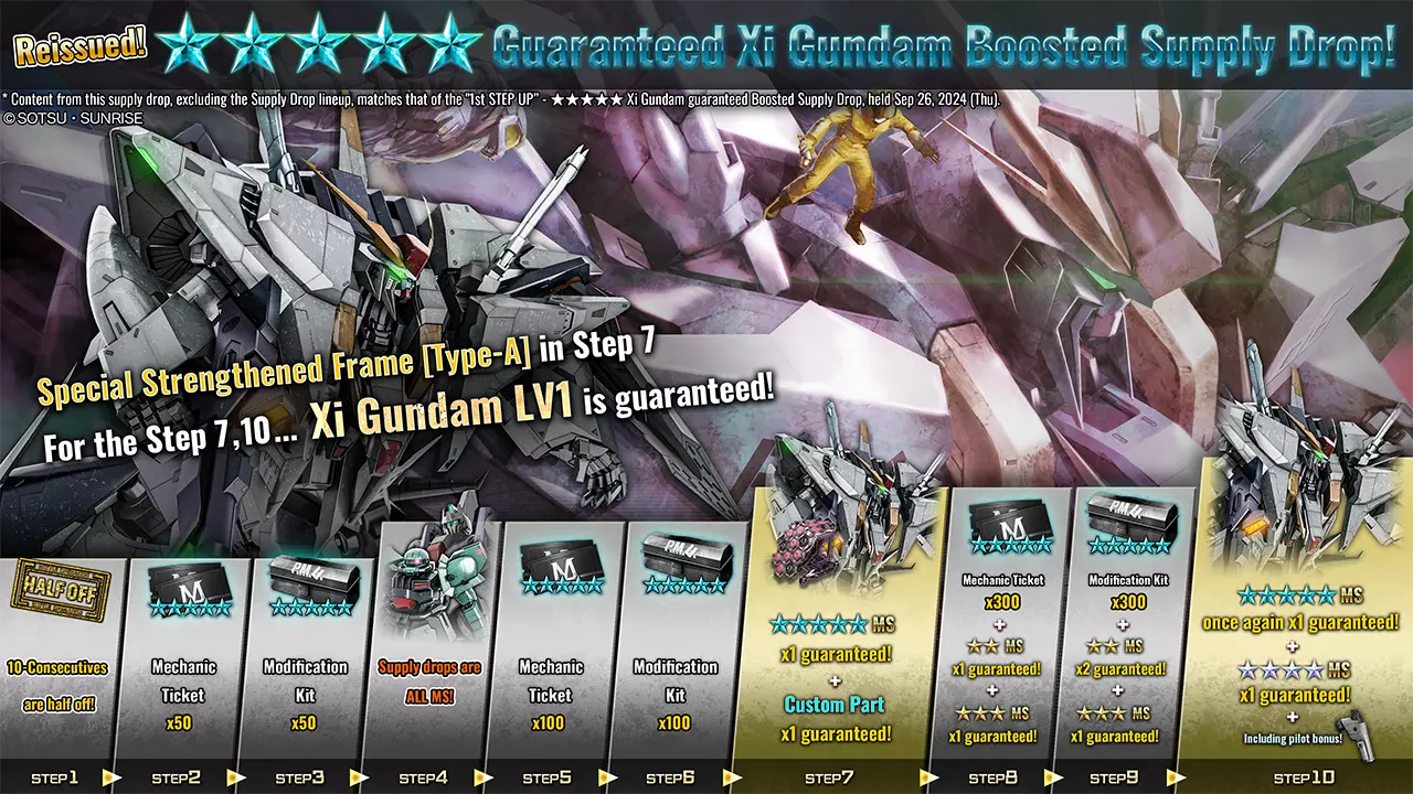 ■活动时间 [太平洋夏令时] 2025年7月10日 01:00 – 2025年7月16日 21:30 [已计划] [中欧夏令时] 2025年7月10日 10:00 – 2025年7月17日 06:30 [已计划] ■活动内容 本次补给箱活动中,可进行10连抽补给箱,最多可提升至第5阶段。 每次进行补给箱抽取,阶段将提升1级,顺序为阶段1→阶段2→阶段3→阶段4→阶段5。 当达到阶段5后,本次限时提升补给箱活动结束。 ・阶段1(15代币):代币50%折扣! ・阶段2(30代币):★★及以上材料掉落率1.5倍! ・阶段3(30代币):保底1个★★★及以上稀有度MS! ・阶段4(15代币):代币50%折扣! ・阶段5(30代币):保底1个F90 [MZ型] LV1和LV2! ※抽取内容与当前正在进行的补给箱相同。详情请查看【道具列表】。 ※同时请务必确认活动日程,以免错过任何内容。 ■【复刻活动】Ξ高达保底阶梯补给 自[PDT]2025年7月10日/[CEST]2025年7月10日起,Ξ高达LV1保底阶梯补给将开启。