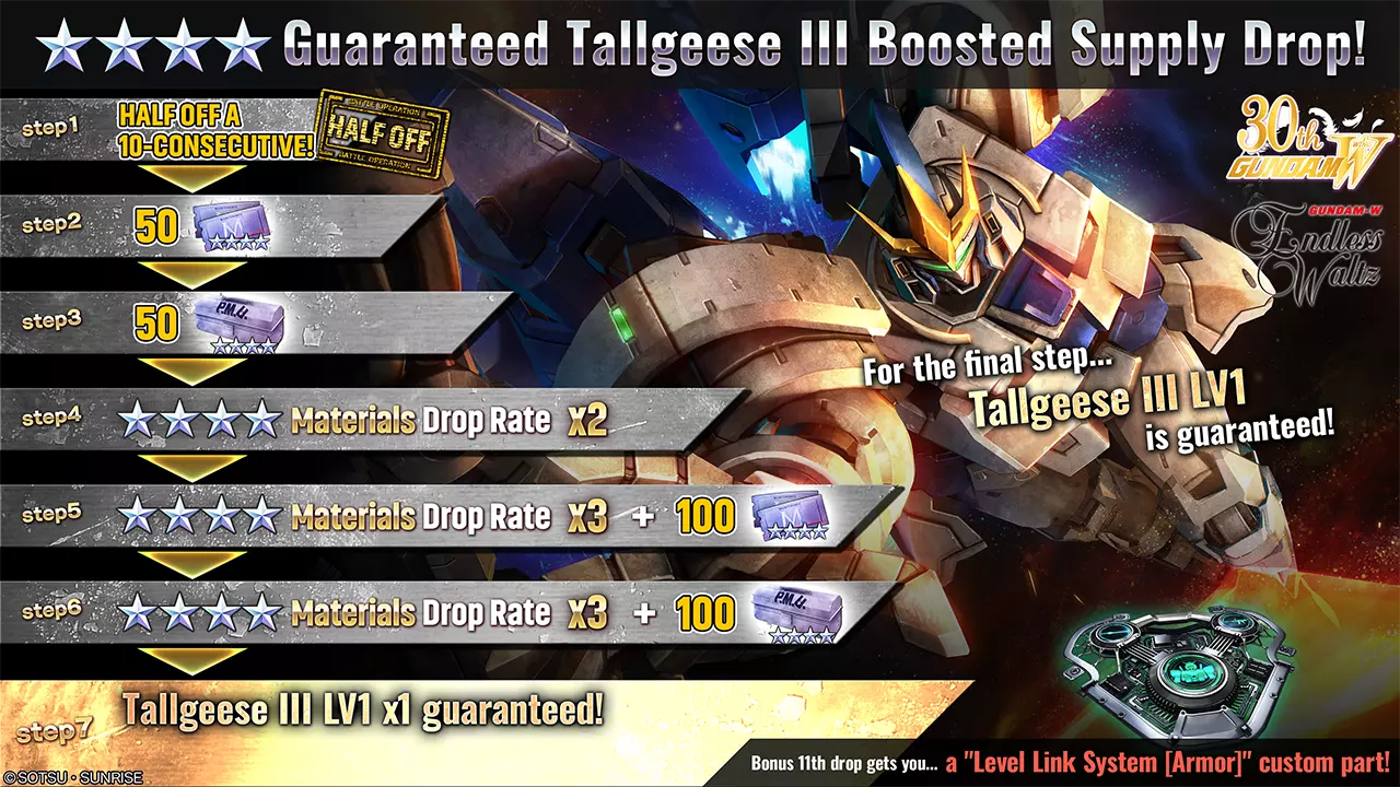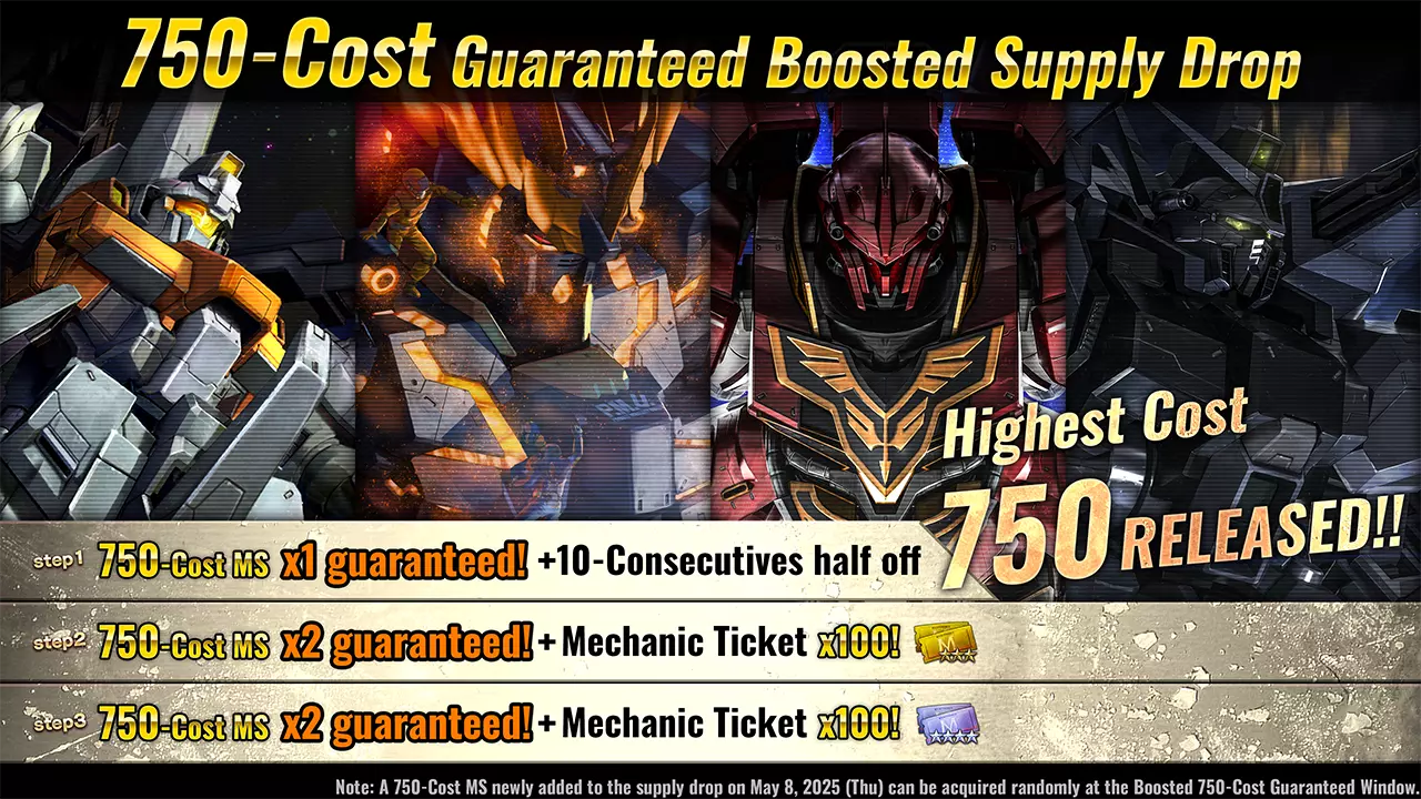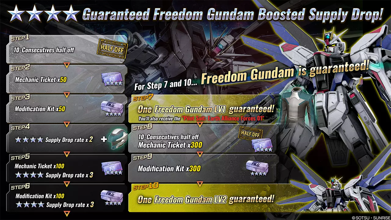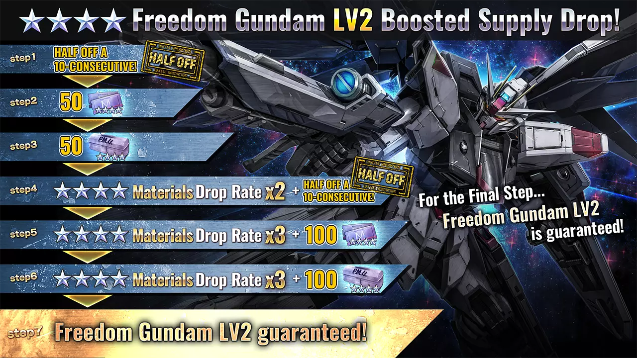 ■活动时间 [PDT] 2025年6月19日 01:00 - 2025年6月25日 21:30(预计) [CEST] 2025年6月19日 10:00 - 2025年6月26日 06:30(预计) ■新增内容 ■机体 ・★★★★ 自由高达 LV2(泛用机体,可在地面/宇宙使用,cost:750) ※上述MS可参与月度MS Bonus Unit活动。 ■活动内容 本次补给抽取活动中,可进行最多7阶段的10连补给抽取。 每次进行抽取后,阶段将提升1级,顺序为:阶段1→阶段2→阶段3→阶段4→阶段5→阶段6→阶段7。 完成阶段7抽取后,强化补给抽取活动结束。 ・阶段1(15代币):代币50%折扣! ・阶段2(30代币):额外获得50张★★★★机械师票!・步骤3(30代币):额外获得50个四星改装套件! ・步骤4(15代币):代币50%折扣!+四星材料掉落率2倍! ・步骤5(30代币):四星材料掉落率3倍!+额外获得100个四星机械师票券!! ・步骤6(30代币):四星材料掉落率3倍!+额外获得100个四星改装套件!! ・步骤7(30代币):必定获得1个【自由高达LV2】!! ※补给内容与当前进行中的补给抽取相同。 详情请查看【物品列表】。 ※请务必查看活动日程,以免错过任何内容。■750成本保底阶梯补给 补给将于[太平洋时间]2025年6月19日/[中欧夏令时间]2025年6月19日开始。