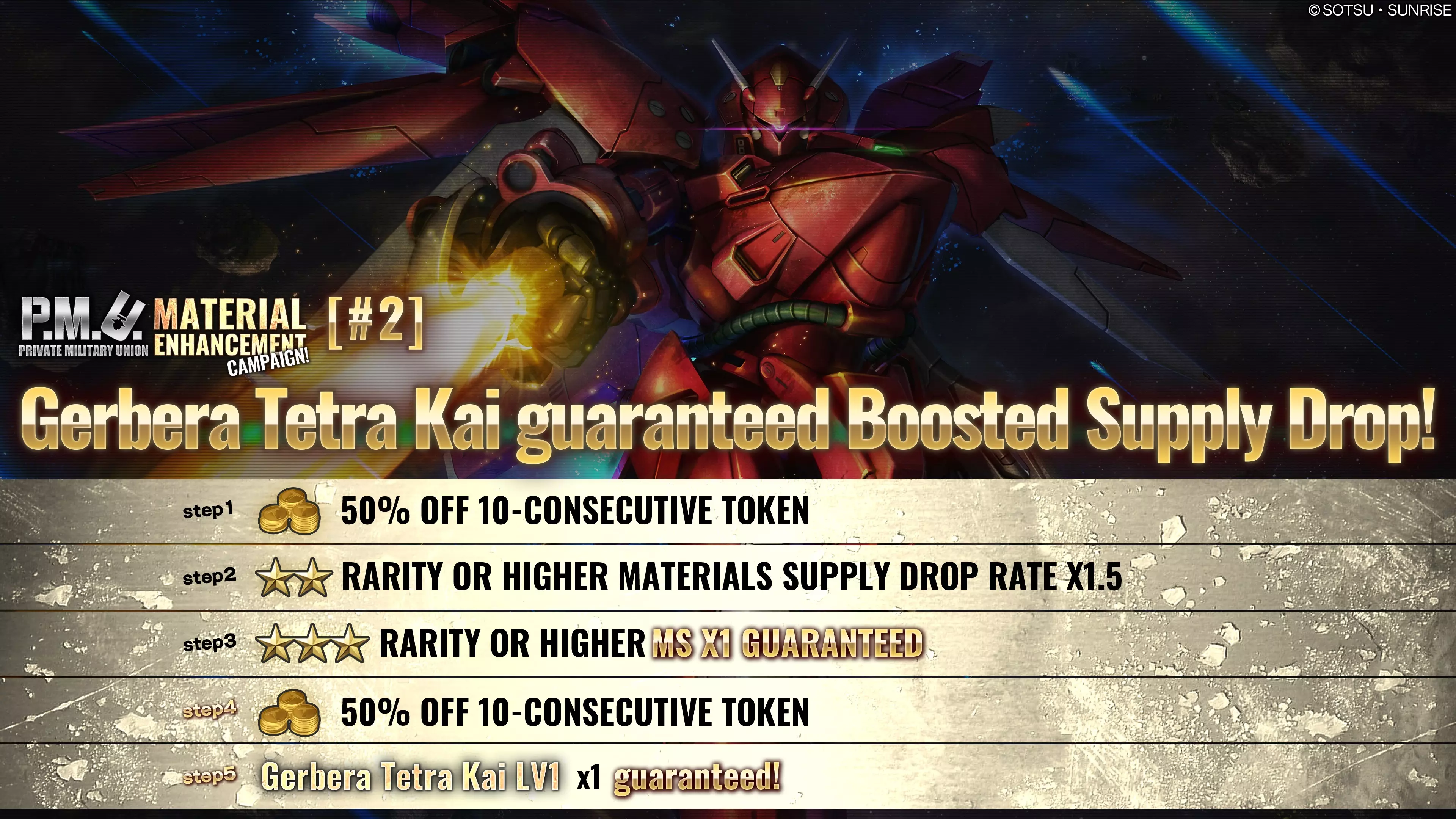 ■活动时间 [太平洋夏令时] 2025年6月19日 01:00 - 2025年6月25日 21:30(预计) [中欧夏令时] 2025年6月19日 10:00 - 2025年6月26日 06:30(预计) ■活动内容 补给箱活动,可请求10连补给箱,最高可达到第3阶段。 每次请求后阶段将提升1级,顺序为阶段1→阶段2→阶段3。 请求阶段3后,强化补给箱活动结束。 ・阶段1(15代币):保底1台COST 750机体!+代币50%折扣! ・阶段2(30代币):保底2台COST 750机体!+100张★★★技师票! ・阶段3(30代币):保底2台COST 750机体!+100张★★★★技师票! ■机体列表 保底机体将从以下列表中随机抽取。新安洲 LV2 泛用型机动战士 适用于陆战/宇宙地图