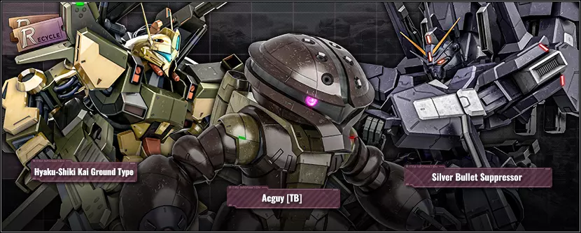 ■其他奖励 ・15张★-★★★级机械师票 ・总计300,000 DP ※与每日任务不同,无需在一天内完成所有内容。活动期间,完成进度将每日继承。 ※可在【H.A.R.O菜单】→【任务】→【限定】中查看进度。 ※奖励可在奖励中心领取。 ■回收计数器新增可兑换材料 ⇒新增材料信息 ■机体 ・新增★★★级银弹压制者LV1–2 ・新增★★级阿格[TB]LV1 ・新增★★级百式改陆战型LV2