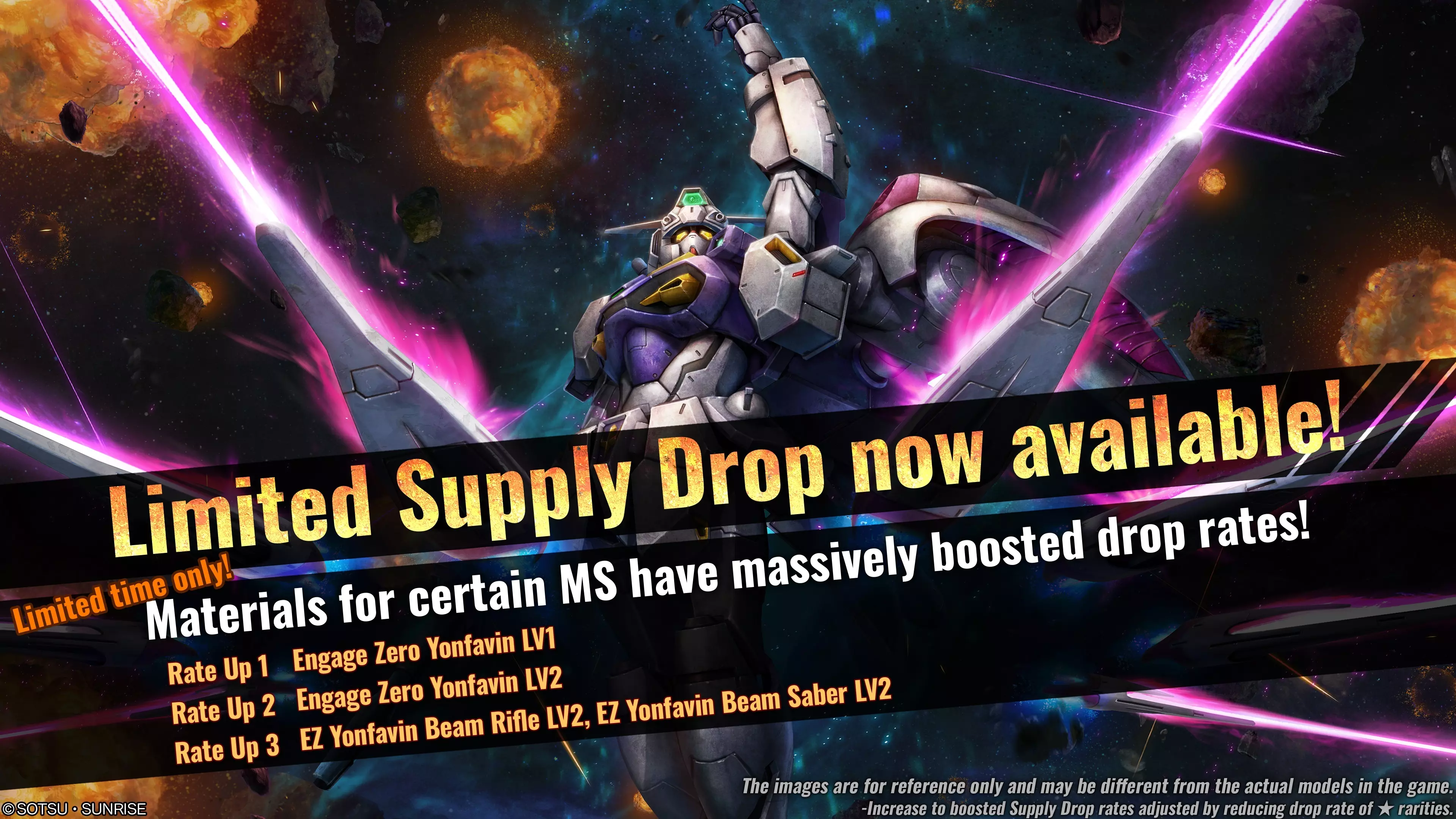 ■活动时间 [PDT] 2025年6月19日 01:00 - 2025年6月25日 21:30(预计) [CEST] 2025年6月19日 10:00 - 2025年6月26日 06:30(预计) ■活动内容 活动期间,可在物资柜台请求【限定补给箱(单次/十连)】。 限定补给箱期间,Engage Zero Yonfavin的掉落率将提升。 ■补给掉落率大幅提升的重点物资 限定补给箱中,各单位等级和武器的掉落率将分别受到影响。◎补给掉落率提升①(物品数量1) ・★★★ engage zero yonfavin LV1(通用单位,地/空两用,cost:600) ◎补给掉落率提升②(物品数量1) ・★★★ engage zero yonfavin LV2(通用单位,地/空两用,cost:650) ◎补给掉落率提升③(物品数量2) ・★★ EZ yonfavin 光束步枪 LV2 ・★ EZ yonfavin 光束军刀 LV2 ■受掉落率提升影响的补给 ・限定补给 ※本次限定补给可获得的材料与当前普通补给的阵容相同。与标准补给不同的是,限定补给中只有指定物品会获得掉落率提升。※限时补给箱的掉落率提升将对各等级单位及单位的主武器产生不同影响。 1-2级单位和武器的掉落率提升情况如下: ・1级单位掉落率提升3% ・2级单位掉落率提升3% ・主武器掉落率提升3% 补给箱掉落率的提升是通过降低【★】稀有度物品的掉落率实现的。 ※关于限时补给箱的详细阵容,请在活动期间查看【物品列表】。 ※请求限时补给箱所需的代币数量与普通补给箱相同。(1次 – 3代币 / 10次 – 30代币) ※请务必查看活动日程,以免错过任何内容。 ■补给箱阵容【RF勇士高达】通知 补给箱阵容已更新。