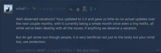 我们工作室同样深切感受到了社区中相当一部分玩家的失望情绪。我们本可以做得更好,也本可以做得更多。我知道这条回复可能会招致很多不满,听起来也像是空洞的陈词滥调,但我实在没有更多可以说的了。我们本可以做得更多,也应该做得更多。我们唯一的希望是通过未来的更新持续带来更多内容,希望我们的老玩家能够回归,同时也能吸引许多新玩家的加入。