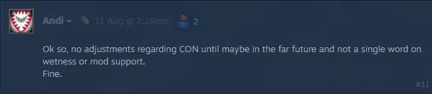很遗憾,关于CON问题我目前没有太多信息可以分享。要修复该系统需要进行一次小规模的重做,但具体何时进行,我无法给出确切时间。至于潮湿问题,将在8月28日上线的更新中修复。模组支持也在考虑中,当我们有更多相关信息时会及时告知大家。