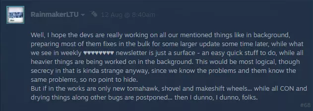 我们计划批量发布这些修复,但会优先处理导致客户端或服务器崩溃的问题以及其他极其严重的漏洞。我认为大多数提到CON掉落、潮湿度和其他问题的玩家也会将这些问题视为极其严重的,但其他事务更为优先。历史将证明这是否是个好主意。不过,我们确实同意,在团队正在处理的工作方面,可能需要更多的透明度。我们会看看在这方面能做些什么。